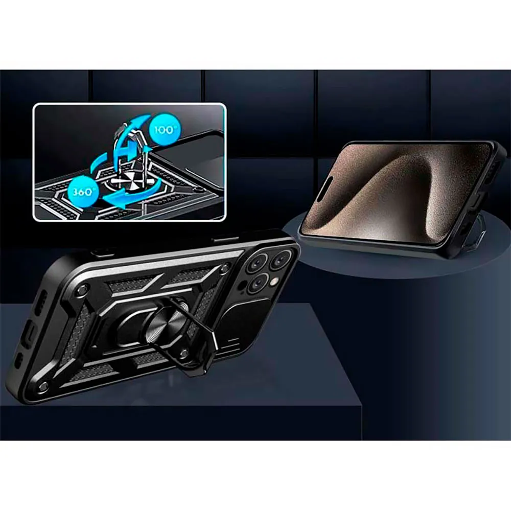In addition to combining a striking design made with robust materials, this case includes protection for the camera module and a magnetic rotating ring.
