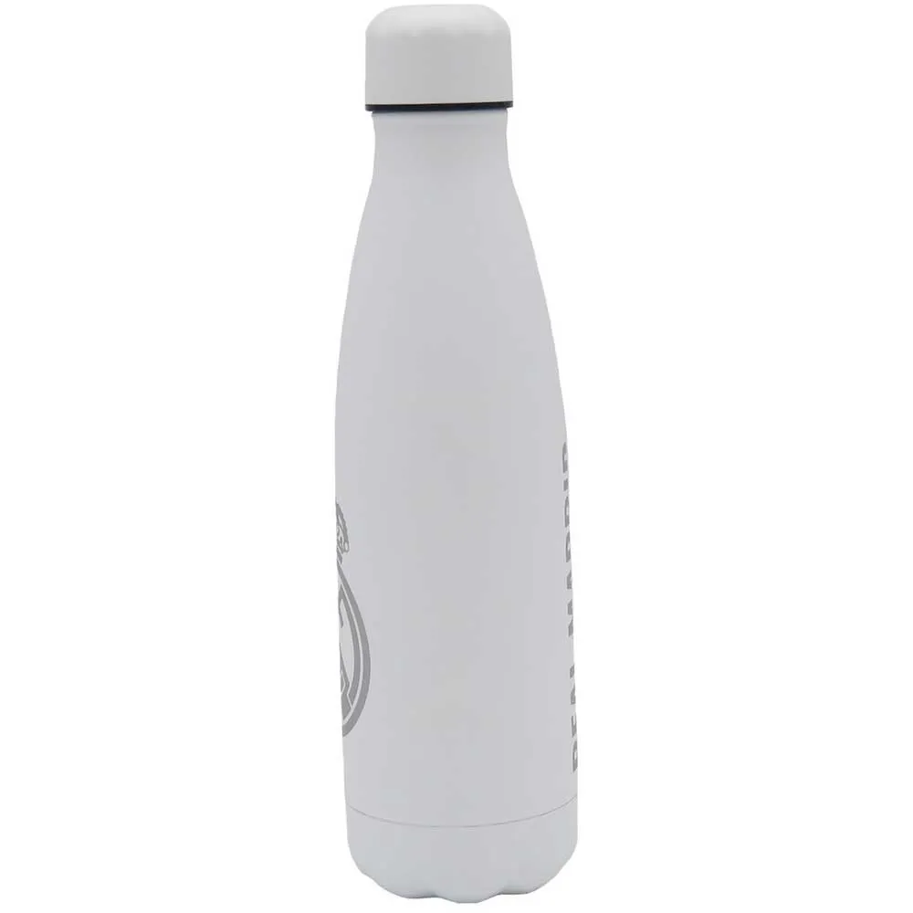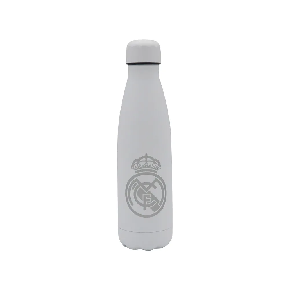 The design embodies the elegance and prestige of Real Madrid. It features a sleek, matte black finish that is both modern and timeless. This is complemented by a premium rubberized texture, which not only provides a comfortable, non-slip grip but also adds a tactile, high-quality feel to the bottle. The centerpiece is the iconic Real Madrid crest, rendered in a brilliant gold that stands out boldly against the black background, ensuring your allegiance is visible to all. The secure, screw-on lid is engineered to be completely leak-proof, giving you the confidence to toss it in your bag without a second thought.
