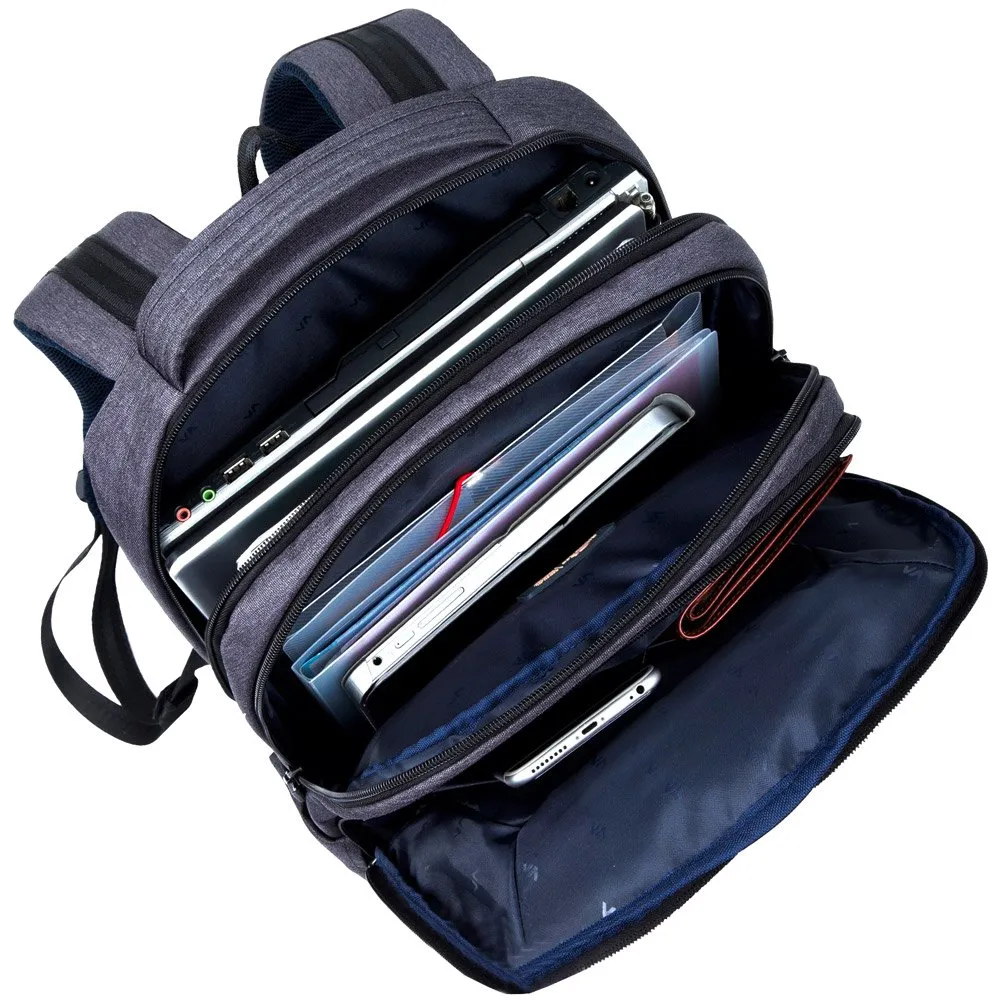 front storage zippered compartment holds an organization panel with slots for business cards, pens, MP3 player, smartphone and USB cables.