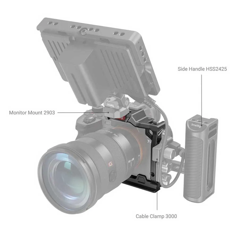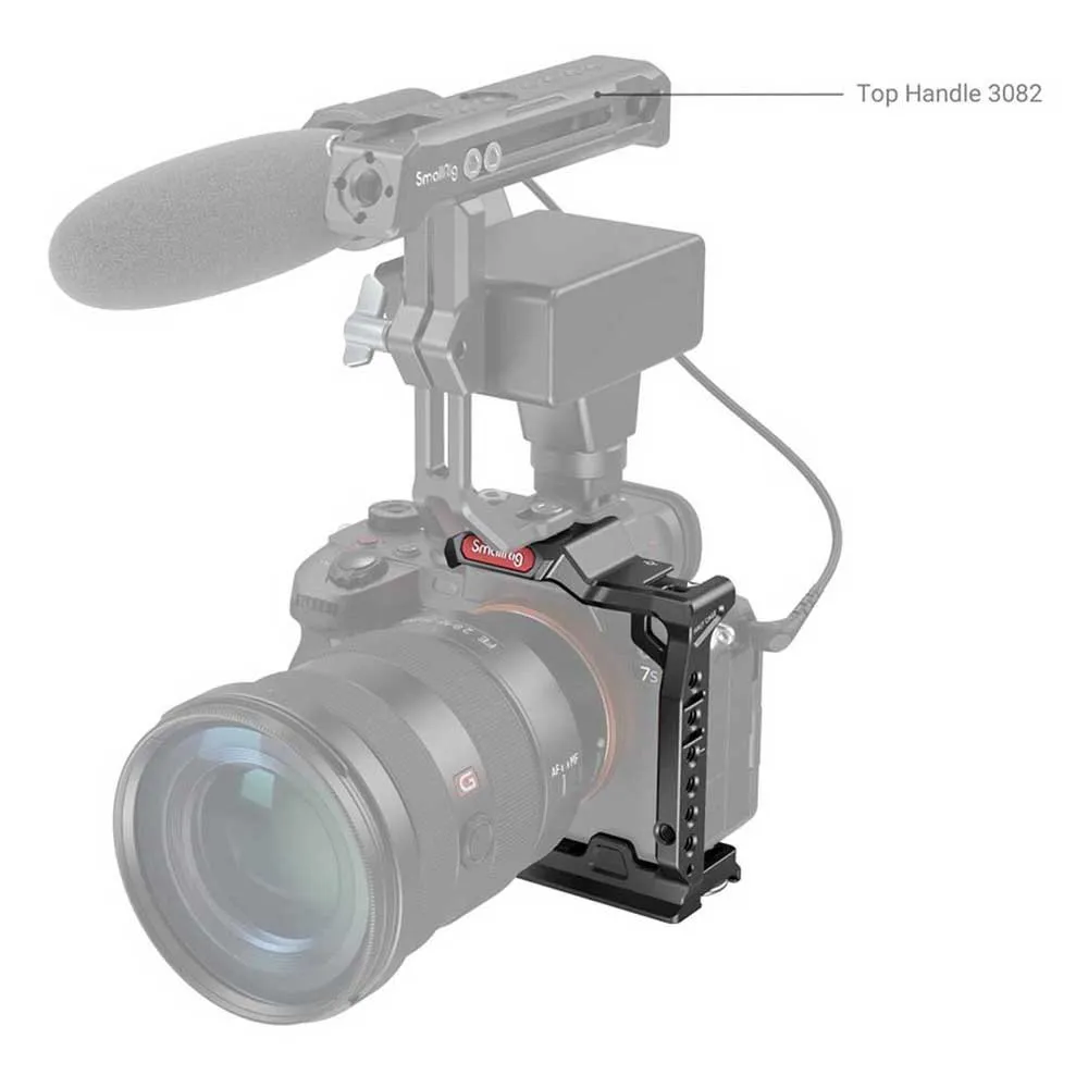 SmallRig Half Cage for Sony Alpha 7 IV/Alpha 7S III 3193 is designed to protect the camera and provide accessory mounting points. It locks the camera via 1/4´´-20 screws on the bottom and prevents twisting with a raised front edge. Featuring rubber pads inside the cage offer full protection against scratching. Provides multiple 1/4´´-20 threaded holes allow to mount a wide range of accessories such as Top-handle HTS2756 and Monitor Mount 2904. Its top features an ARRI 3/8´´-16 locating hole for mounting Top Handle 2165 and Monitor Mount 2903. Built-in cold shoe mount on the top supports microphone and LED light, you can also attach the Monitor Mount 2905. The bottom of the cage comes with a built-in Arca type plate for attaching directly to DJI RS 2 and RSC 2 gimbal and features 1/4´´-20 threaded holes for mounting onto other quick release plates. A built-in flat-head screwdriver is store on the bottom for quick assembly. In addition, an optional HDMI Cable Clamp 3000 for Sony Alpha 7 IV/ Alpha 7S III can be purchased to protect the HDMI port.
