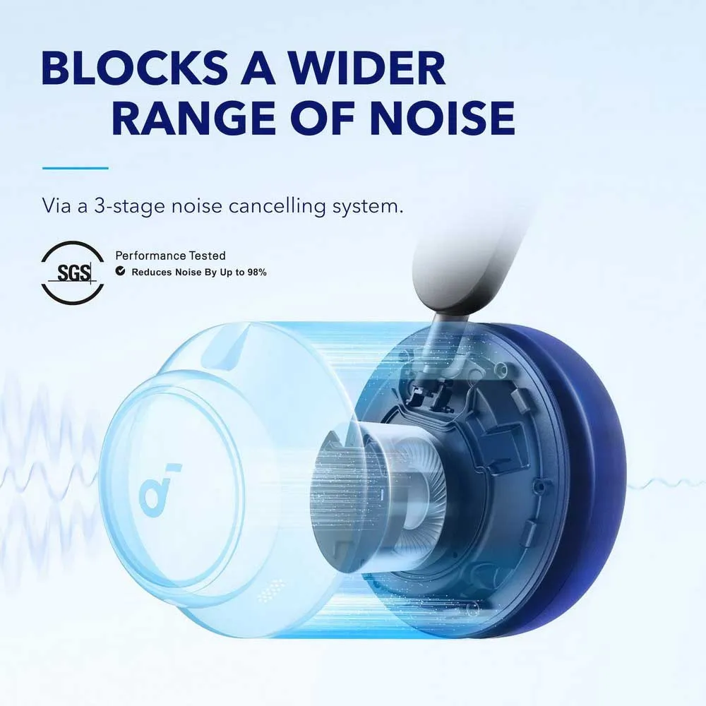 - The Sound core Space Q45’s real point of distinction is its three-stage noise cancellation system. This innovative system targets low, mid, and high frequency noises individually. Hybrid Active Noise Cancellation effectively reduces low-frequency sounds, such as airplane engines and traffic noise, achieving a reduction of up to 98% . The other two stages filter out mid- and high-frequency noises, such as crying babies or barking dogs, allowing you to enjoy your music in an oasis of calm.