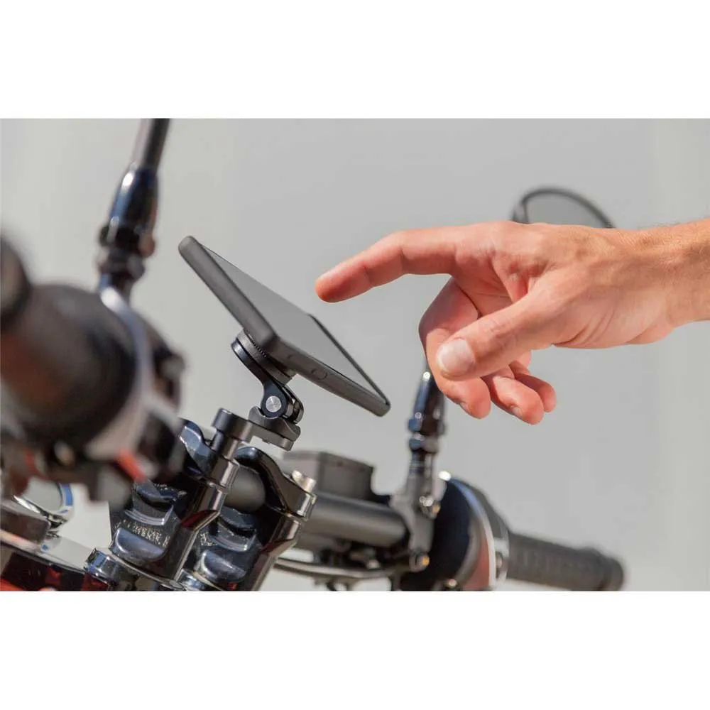 attach your sptm connect phone case, or other sp connecttm compatible devices to your motorbike with the moto mount pro. the mount is cnc milled out of aircraft grade aluminum and fits standard and oversized handlebars. to further protect your smartphone the mount also has a unique vibration dampening system that cuts g-forces by up to 40% (depending on motorbike & phone model). you can mount it with the positioning arm or as a direct clamp mount - both versions allow 360° rotation to find the perfect position for your phone.