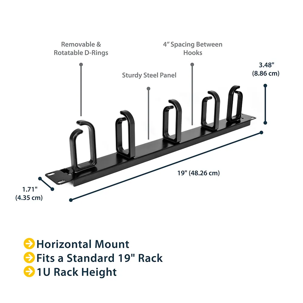 Constructed of high-quality steel, the cable organizer panel offers 5 removable ABS plastic D-Ring hooks, spaced 4in (105mm) apart for routing cables through your server rack and reducing cable strain.