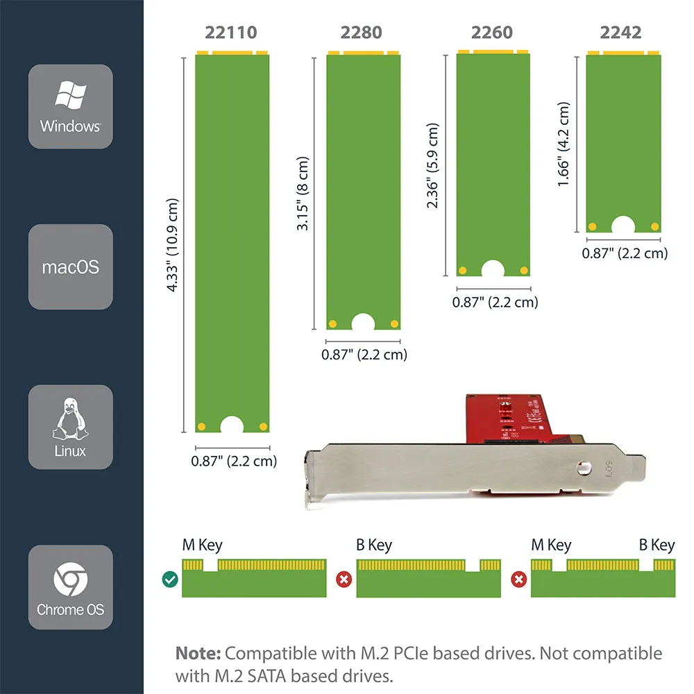 The adapter supports PCIe 3.0 x4 NVMe (M Key) and PCIe-AHCI M.2 SSDs including 2242, 2260, 2280, and 22110 drives.