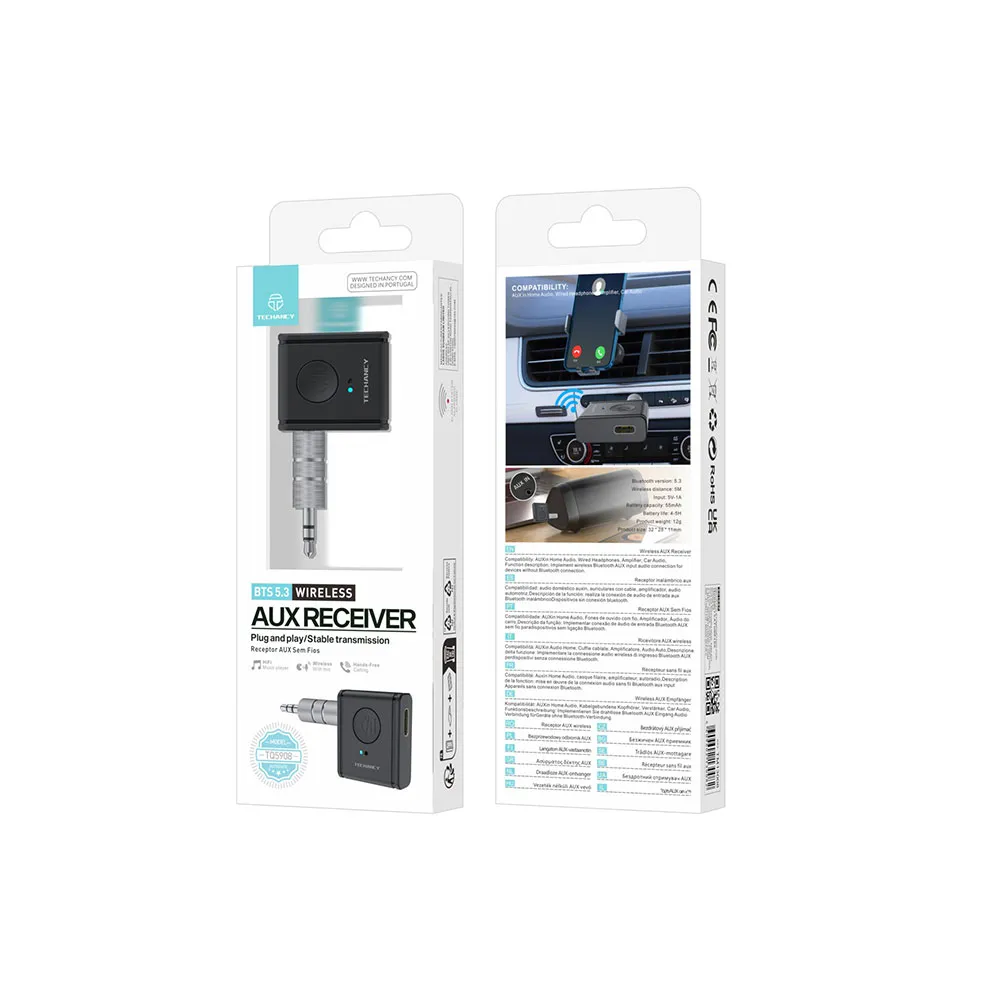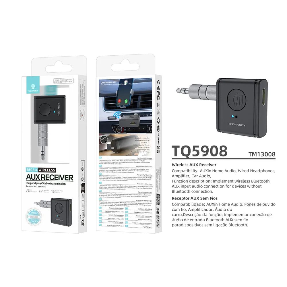 Product description: Techancy TQ5908 Wireless AUX Receiver. Plug-and-Play + Bluetooth 5.3 Connection. Enables wireless Bluetooth connectivity for traditional audio systems, wired headphones, car audio systems, and other non-Bluetooth devices via a 3.5mm AUX interface.