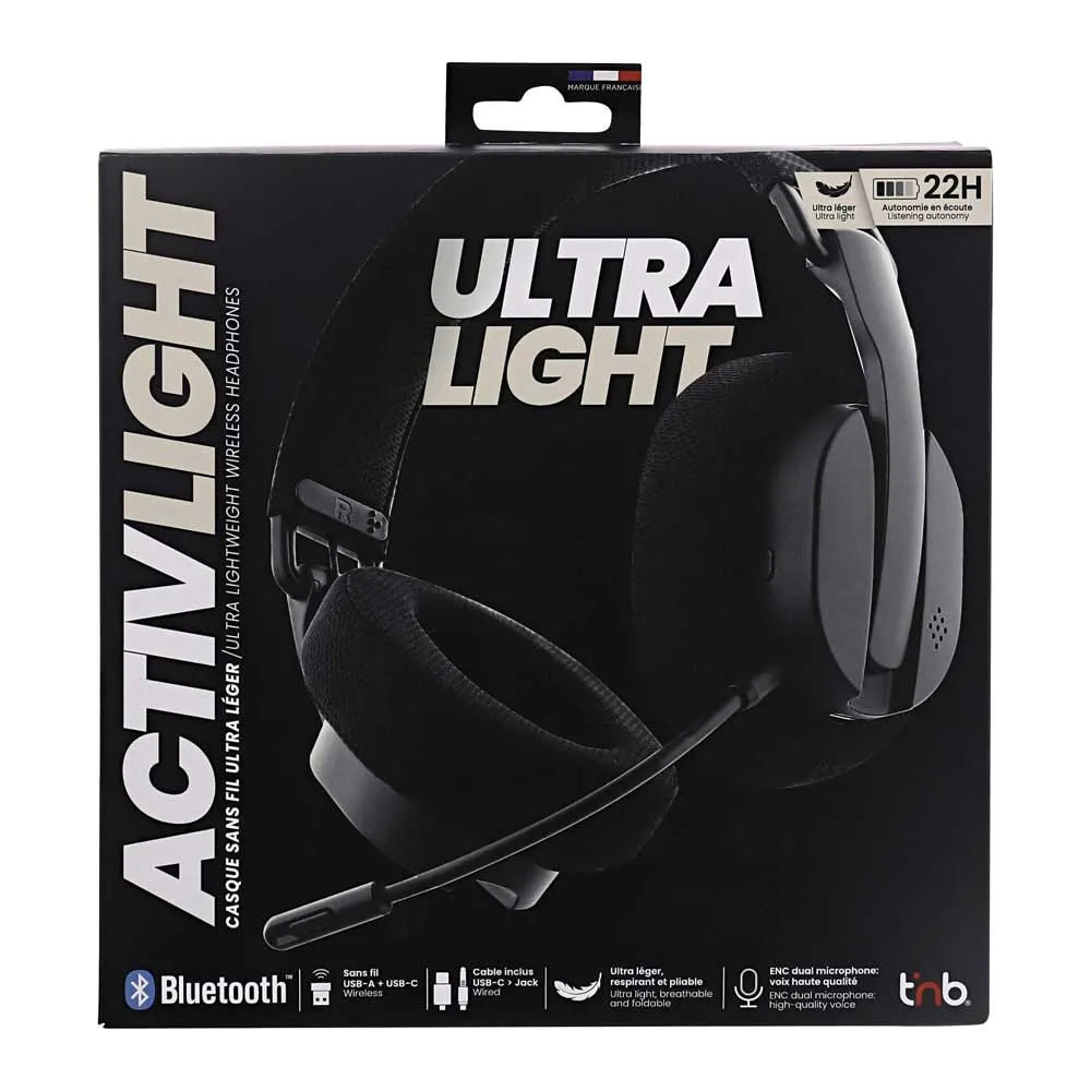 The ultra-lightweight Activlight wireless headset has been designed to provide a comfortable audio experience for all your uses, whether for gaming, calls or listening to music. Weighing only 158g, the Activlight is perfect for extended use, video conferencing or gaming. Enjoy the flexibility of 2.4GHz connectivity via USB-A and USB-C, Bluetooth and 3.5mm jack, allowing you to easily switch between different devices. Equipped with two microphones for external noise reduction (ENC), this headset guarantees clear voice capture, ideal for online gaming and calls to be perfectly heard by iPhone users with the Siri activation shortcut. The 400mAh rechargeable battery offers long-lasting battery life, allowing you to enjoy your music or games without interruption. The foldable design of the headset makes it easy to carry and store, perfect for travel. Detachable microphone. This headset is the essential accessory for all gaming and music lovers looking for comfort, sound quality and versatility.