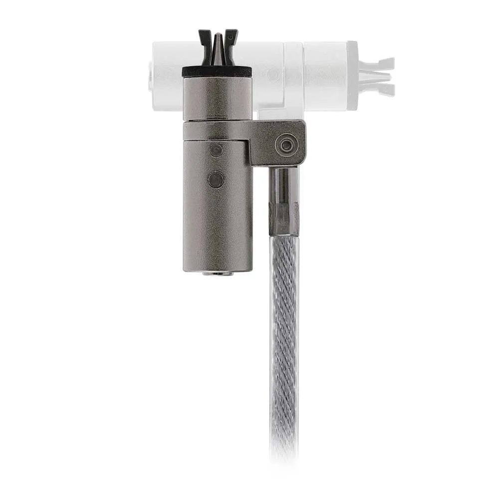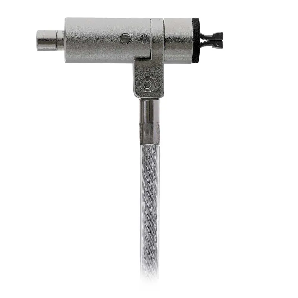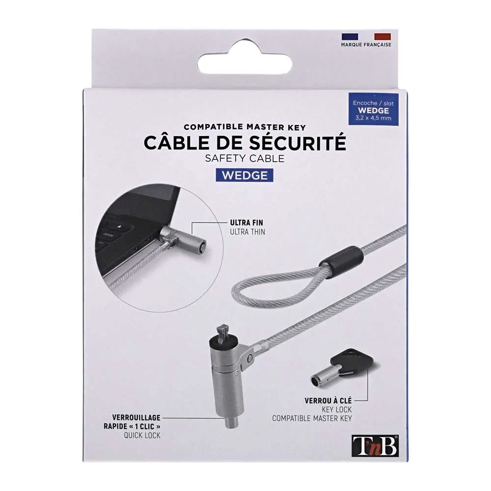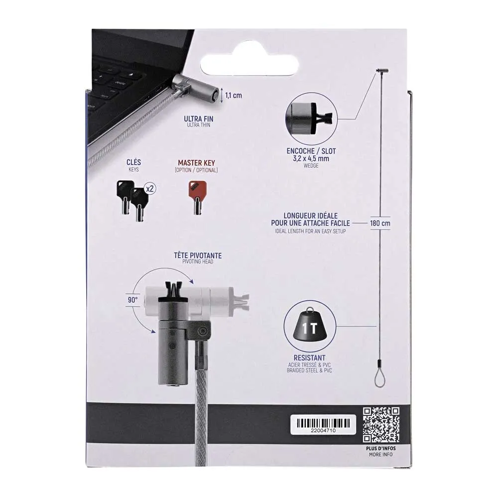 Ultra-resistant, braided steel cable with PVC coating and zinc lock. Length = 1.80m. Allows you to easily attach the device to the desk. Thin and adjustable swivel heads to attach it comfortably, whatever the position of the PC. Easy locking in 1 click thanks to its push button. Supplied with two personal keys excluding master.