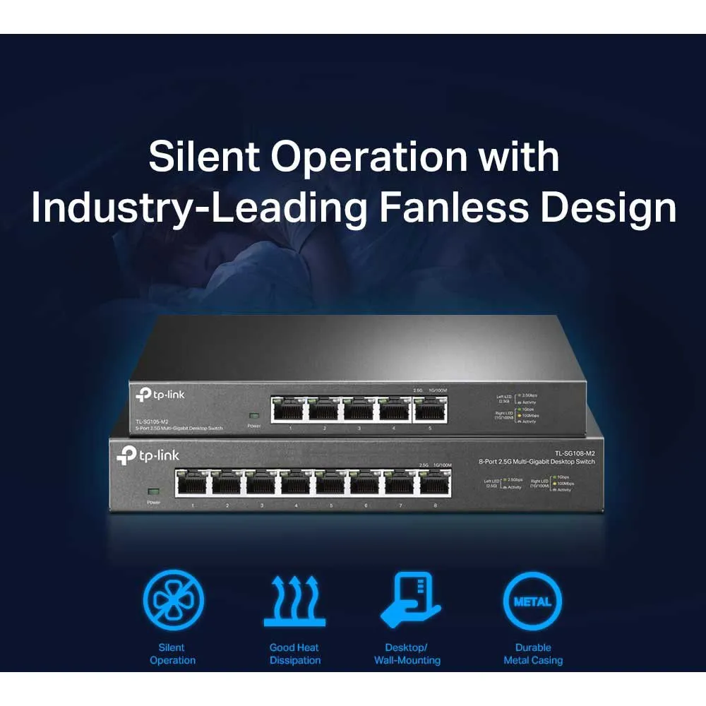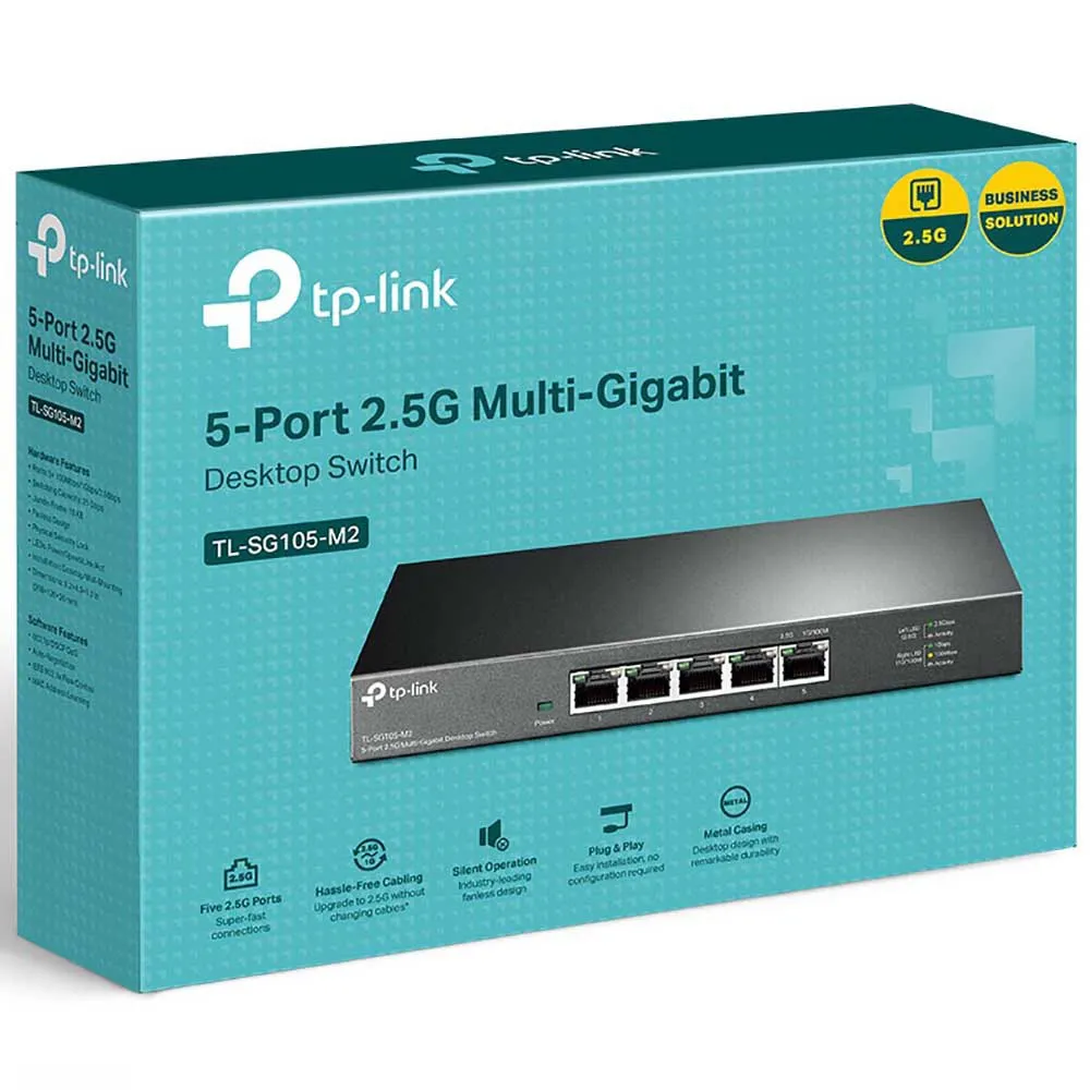 Unleash the full potential of your network with the TP-LINK TL-SG105-M2 switch. Featuring five 2.5-Gigabit ports, it delivers blazing-fast connections for your 2.5G NAS, server, gaming PC, and WiFi 6 APs, providing up to 25 Gbps of total switching capacity. Instantly upgrade your setup with simple plug-and-play deployment, no new Cat6 wiring needed. Built for LAN parties, home offices, and 4K streaming, its durable metal casing and industry-leading fanless design ensure powerful, silent operation in any environment. EU Plug