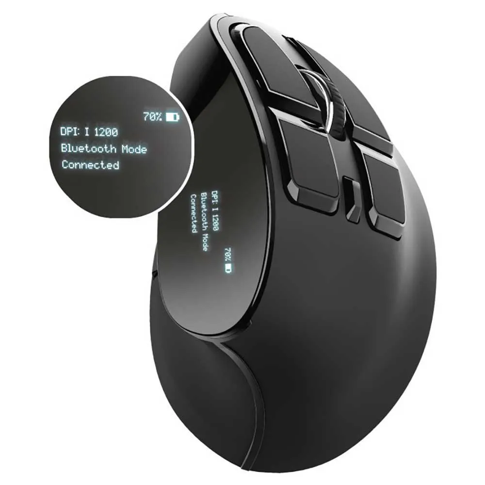 Stop straining your wrists during long workdays. With the Trust Vox Wireless Rechargeable Ergonomic Mouse you continue working for as long as you want. The vertical shape of this ergonomic mouse reduces wrist and arm strain, while the adjustable buttons and the LED display menu help you improve your workflow.