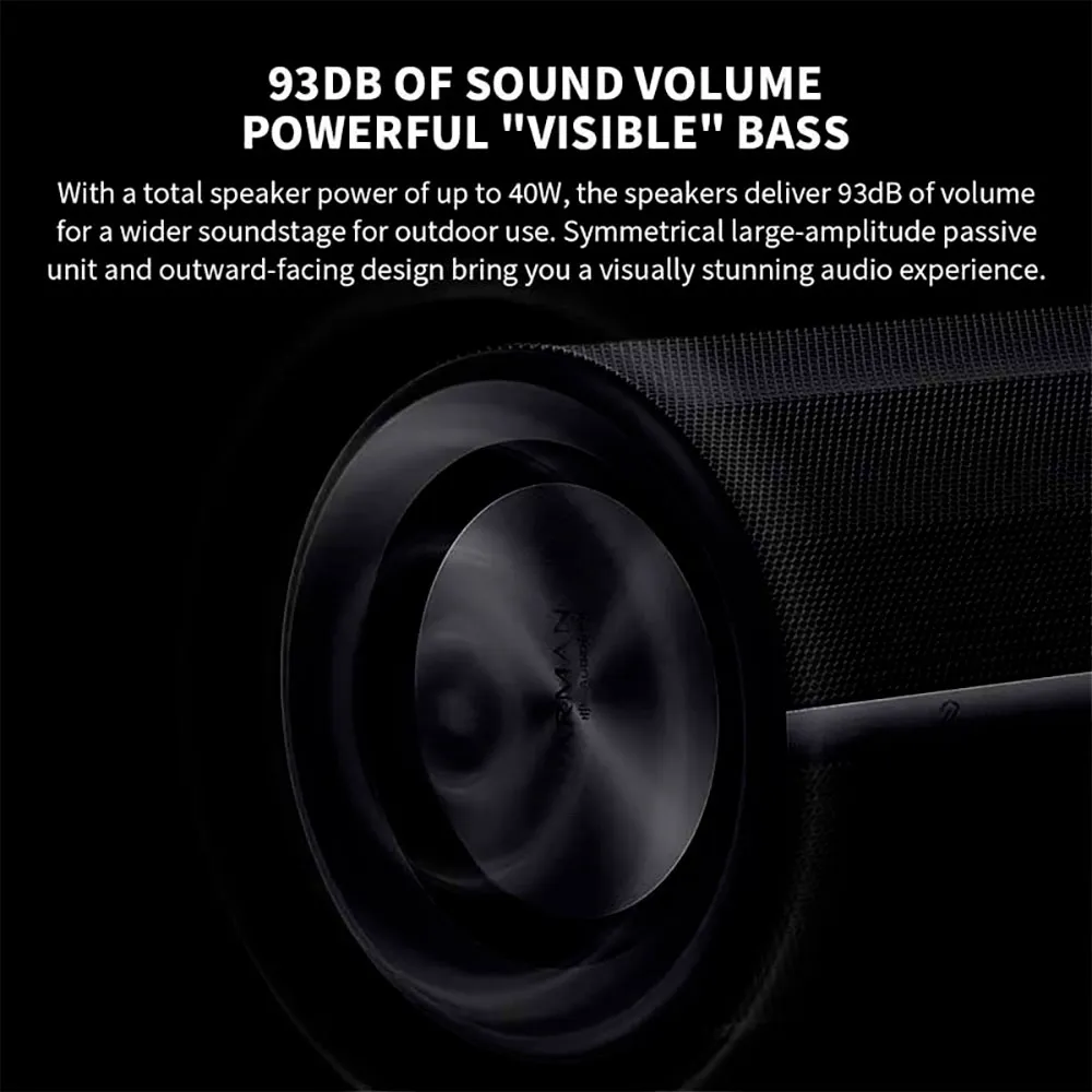 With a total power of up to 40W, this speaker is capable of reaching volume levels of 93dB, offering a wide and perfect sound stage for outdoor use.