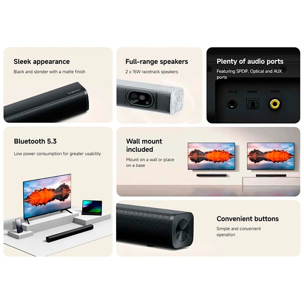 Elevate your PC or TV audio with the XIAOMI QBH4286EU Soundbar. Experience immersive, room-filling sound powered by 8 dedicated sound units, delivering crystal-clear dialogue and deep, resonant bass for movies, gaming, and music. Its sleek, minimalist design with a fabric mesh front seamlessly integrates into any modern setup. Connect effortlessly with a wide range of inputs, including Optical and AUX, or stream your favorite playlists wirelessly via Bluetooth. Simple to set up and versatile enough for tabletop or wall-mounted placement, it´s the perfect audio upgrade