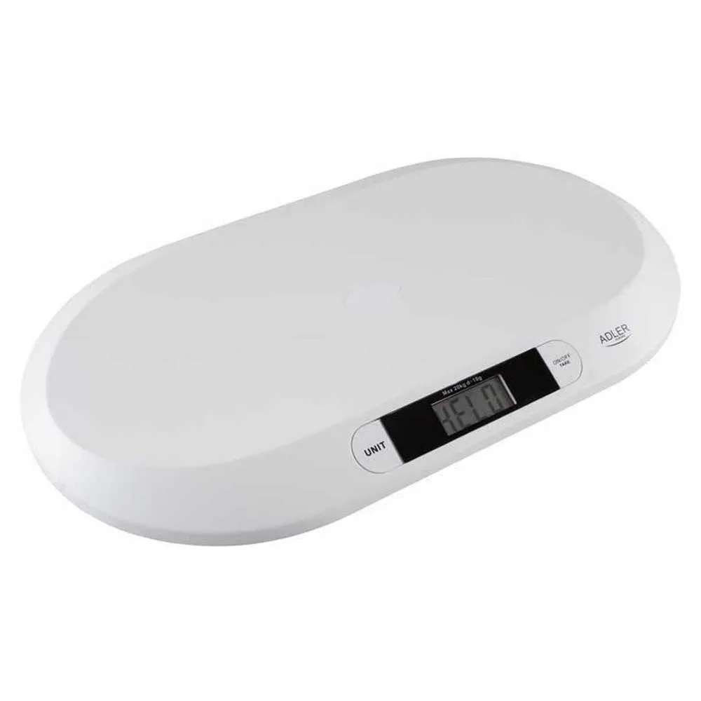 Toda madre sabe que controlar regularmente el peso del niño es una acción muy importante y necesaria en cada etapa de su crecimiento. Se trata de una práctica significativa si queremos garantizar un crecimiento sano y sin problemas del niño. La báscula para bebés ADLER AD 8139 es una báscula electrónica moderna para bebés pequeños, que hará que el control del peso se realice de forma rápida y sin el menor esfuerzo. Su elegante diseño y su color blanco la convertirán en un original elemento decorativo de la habitación del bebé.