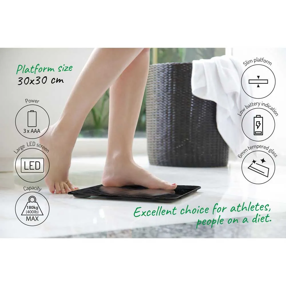 Báscula de baño electrónica precisa con una carga máxima de 180 kg. Una excelente opción para atletas, personas a dieta y otras personas que se preocupan por su peso corporal. Fabricada en vidrio templado duradero, equipada con una superficie antideslizante que garantiza la seguridad de uso y una apariencia estética. Alta precisión (100 g) permite una medición precisa. La báscula tiene la función de reinicio del resultado e indicadores: sobrecarga y consumo de batería. El apagado automático ayuda a ahorrar energía y aumenta la comodidad de uso.