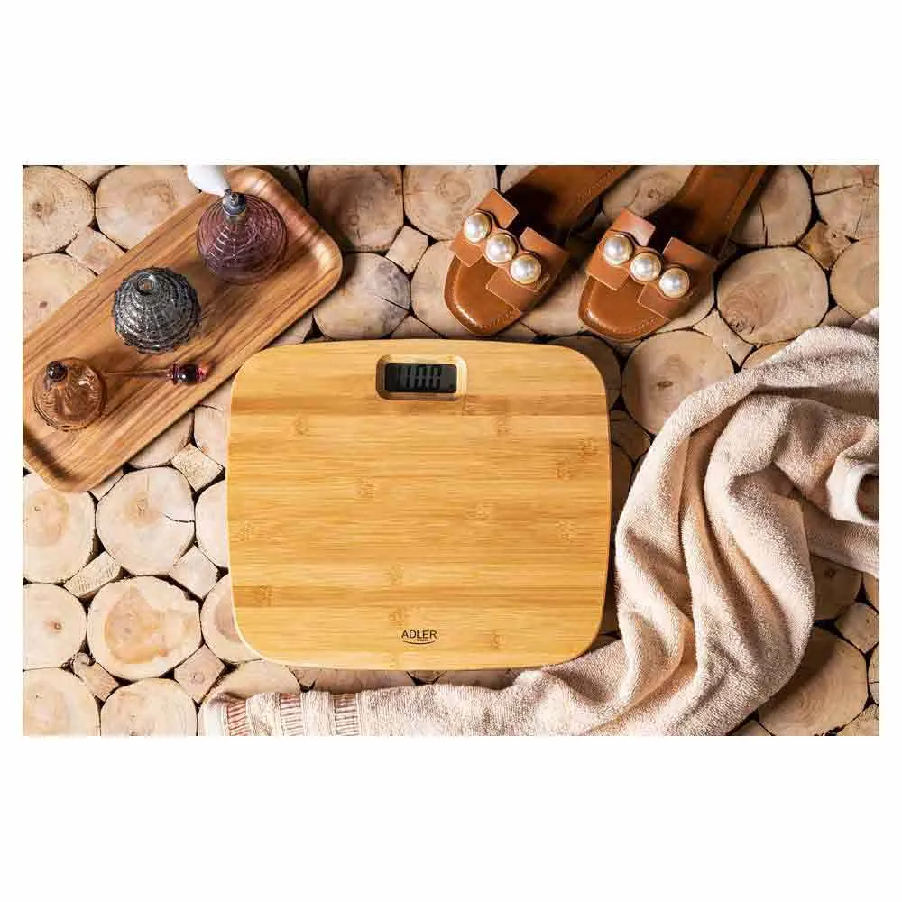 - La báscula de baño sorprende por su aspecto y su referencia a la naturaleza. Gracias a la plataforma de bambú de 12 mm, funcionará en una habitación diseñada tanto en estilos tradicionales como modernos. Puedes ponerte de pie cómodamente sobre ella, la superficie es agradable al tacto y fácil de limpiar. El peso tampoco ocupa mucho espacio.