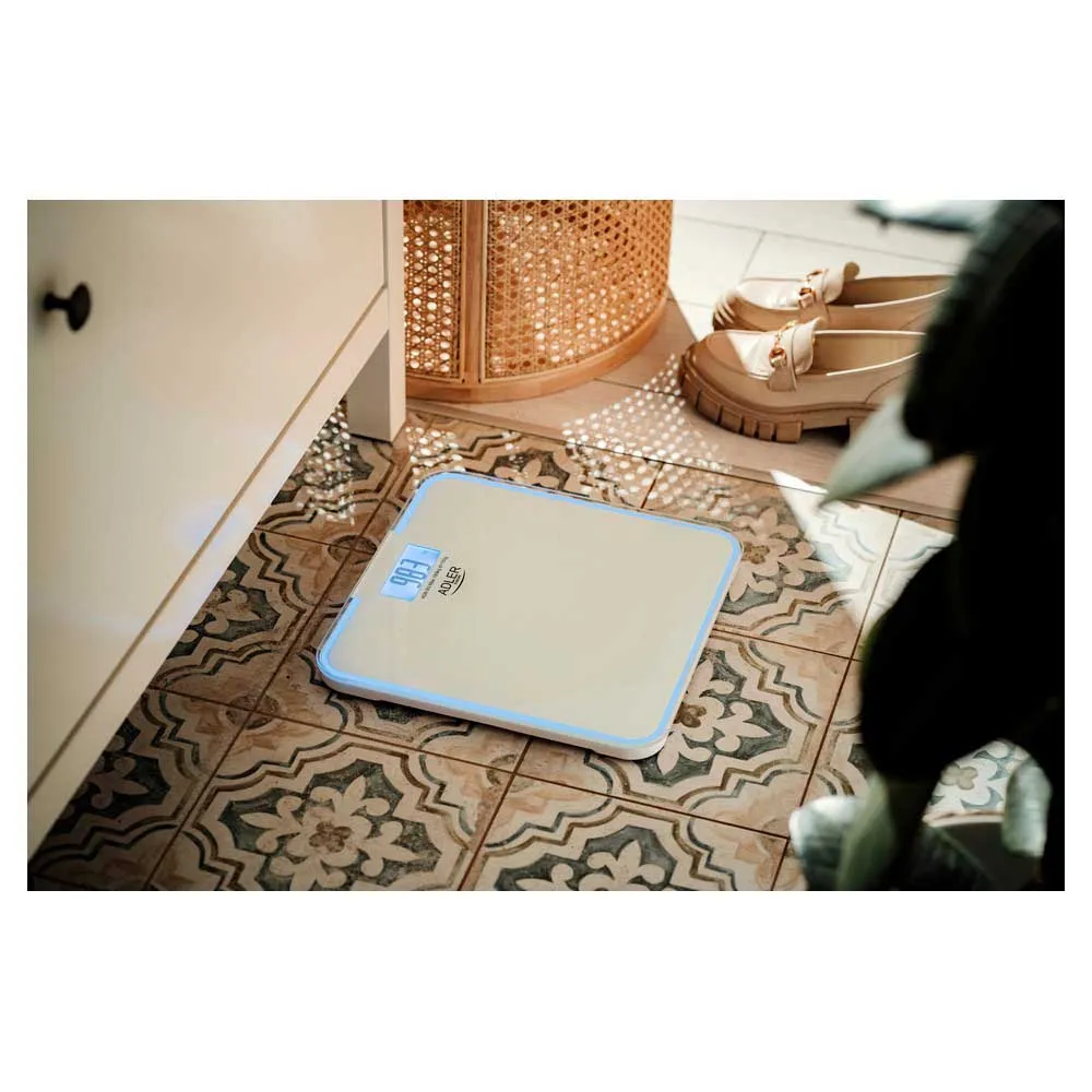 - Retroiluminación azul del borde y la plataforma: la elegante retroiluminación azul no solo facilita el uso de la báscula en habitaciones con poca luz, sino que también agrega un carácter moderno al dispositivo.