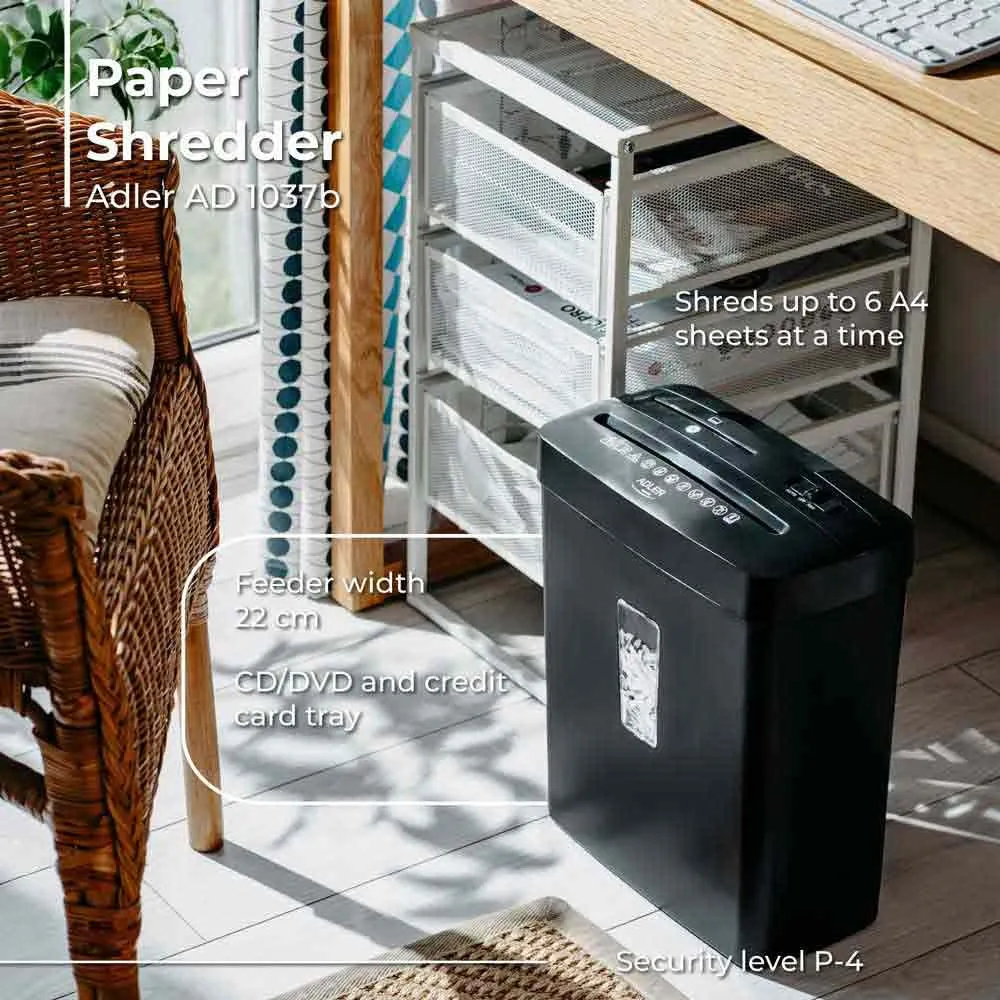 Adler AD 1037 es una destructora de documentos eficiente y compacta que proporciona un alto nivel de seguridad y facilidad de uso.
