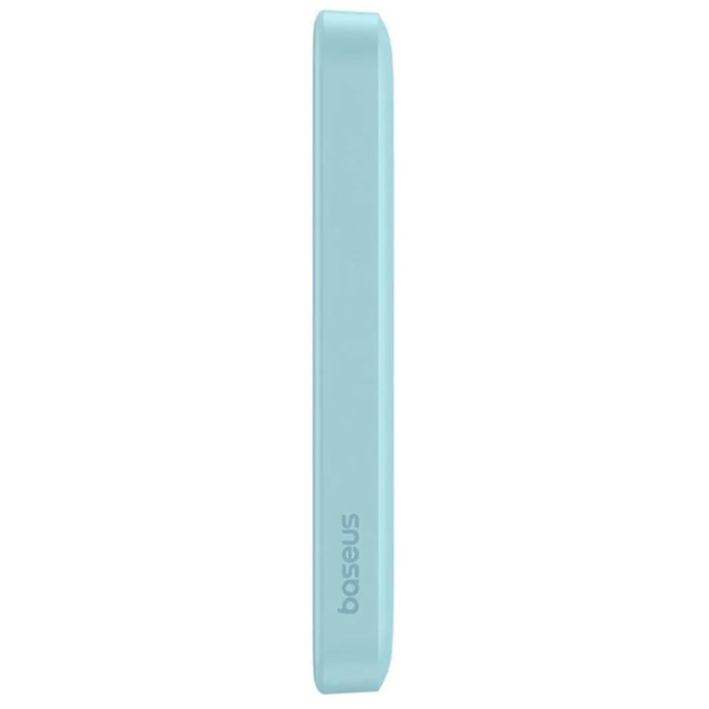 Power Bank Mini de Baseus de 5000mAh con cable USB-C, carga rápida 20W y es compatible con MagSafe de Apple, color azul.