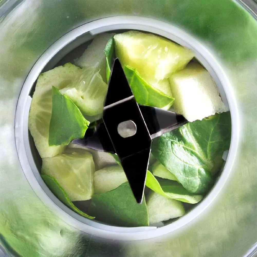 - Cuchilla de 4 hojas con recubrimiento de titanio negro que mantiene el acero afilado por más tiempo, diseñada para picar hielo y dar a los batidos una textura perfecta.