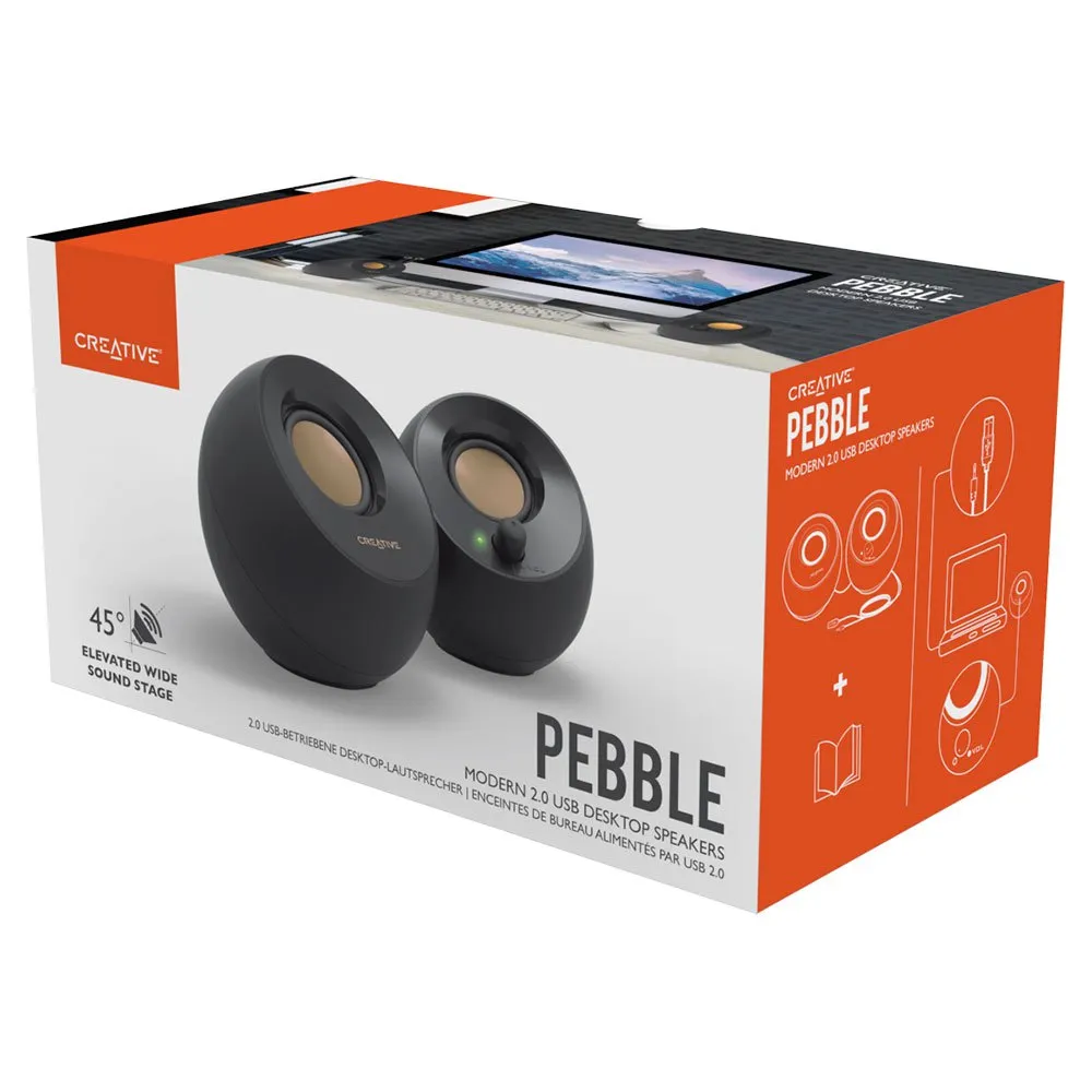 Altavoces 2.0 de escritorio con corriente vía USBInspirados por los jardines de rocas japoneses, los Creative Pebble con su forma de orbe son un sistema de altavoces 2.0 estilizado y elegante que luce perfecto en cualquier hogar y oficina.
