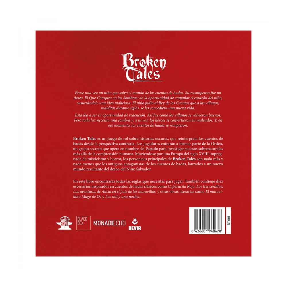 DE 30 - 120 MI? Érase una vez un niño que salvó el mundo de los cuentos de hada? Su recompensa fue un dese? El Que Conspira en las Sombras vio la oportunidad de empañar el corazón del niño, susurrándole una idea malicios? El niño pidió al Rey de los Cuentos que a los villanos, malditos durante siglos, se les concediera una nueva vid? Esta iba a ser su oportunidad de redenció? Así fue como los villanos se volvieron bueno? Pero toda luz necesita una sombra y, a su vez, los héroes se convirtieron en malo? En ese momento, todos los cuentos de hadas se rompiero? Broken Tales es un juego de rol sobre historias oscuras, que reinterpreta los cuentos de hadas desde la perspectiva contrari? Los jugadores entrarán a formar parte de la Orden, un grupo secreto que opera en nombre del Papado para investigar sucesos sobrenaturales más allá de la comprensión human? Moviéndose por una Europa del siglo XVIII impregnada de misticismo y horror, los personajes principales de Broken Tales son nada más y nada menos que los antiguos antagonistas de los cuentos de hadas, lanzados a un nuevo mundo resultante del deseo del Niño Salvado? En este libro encontrarás todas las reglas que necesitas para juga? También contiene diez escenarios inspirados en cuentos de hadas clásicos como Caperucita Roja, Los tres cerditos, Las aventuras de Alicia en el país de las maravillas, y otras obras literarias como El maravilloso Mago de Oz y Las mil y una noche?