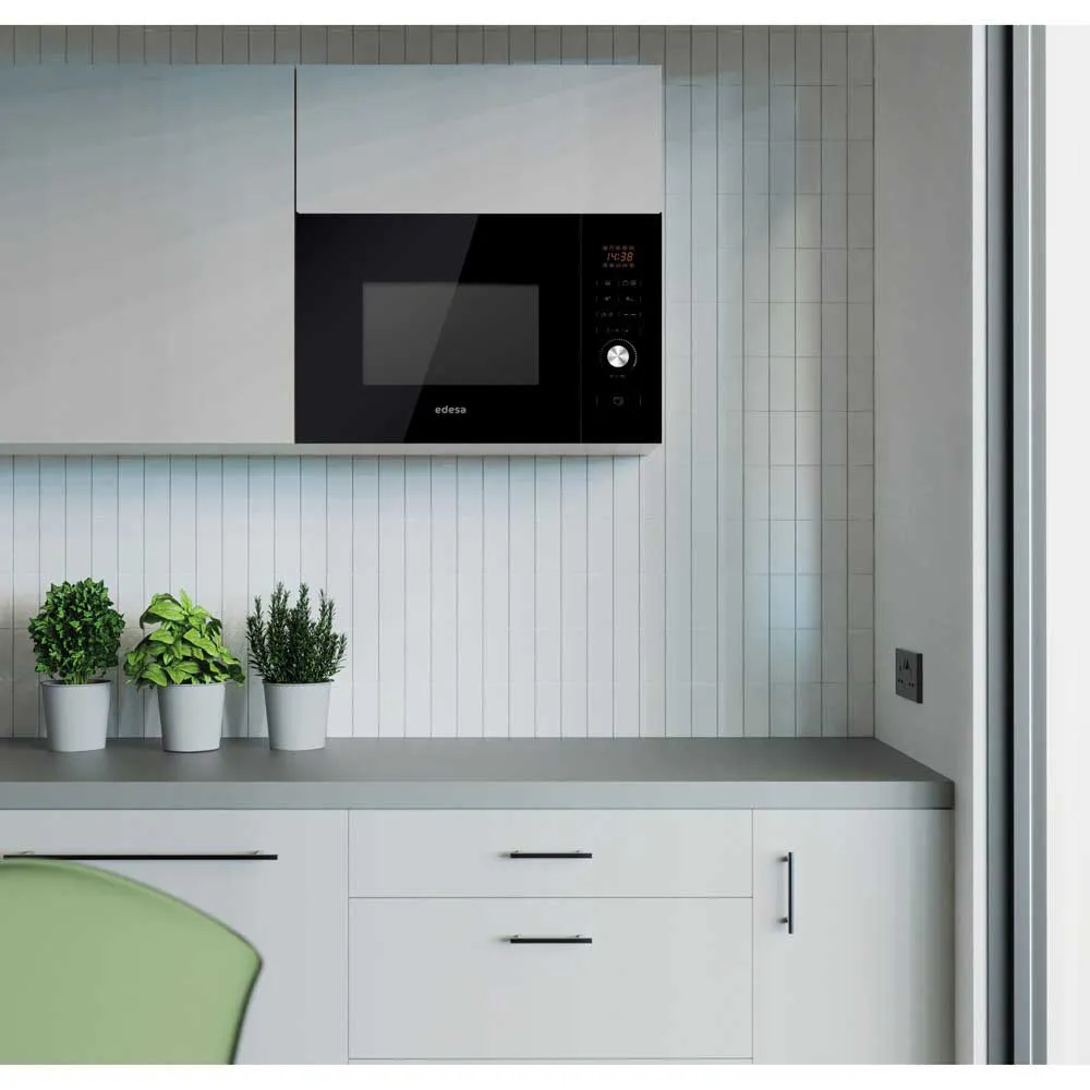 Microondas de encastre de 25 litros en cristal negro de apertura táctil y Display con tecnología LED con funciones microondas, grill, grill + micro y programadas (descongelación, calentamiento y cocinado por tiempo y tipo de alimento) y Selector de potencia de calentamiento con 5 niveles, 900W y Selector de potencia de grill con 3 niveles 1200W.