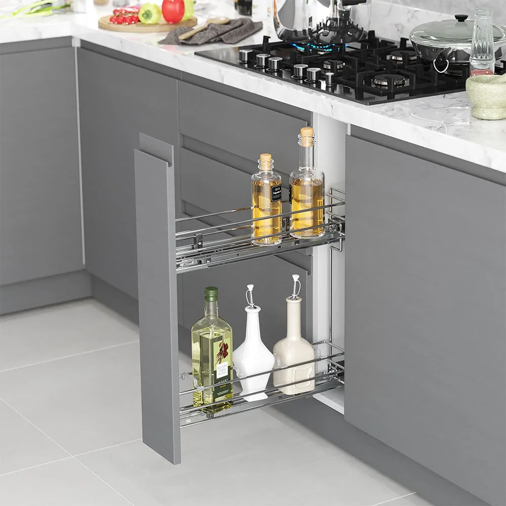 Estante extraíble para botellas para muebles bajos de cocina fabricado en acero cromado, ideal para espacios reducidos o muebles auxiliares. Fácil instalación: fijación en el lateral izquierdo del mueble y permitiendo un ajuste total de la puerta. La estructura es de acero cromado con 2 niveles e incorpora guías de rodillos con extracción total y cierre suave que permiten un suave deslizamiento del sistema evitando golpes. La cesta inferior dispone de 4 agujeros para la organización de las botellas. Capacidad de carga hasta 30kg.