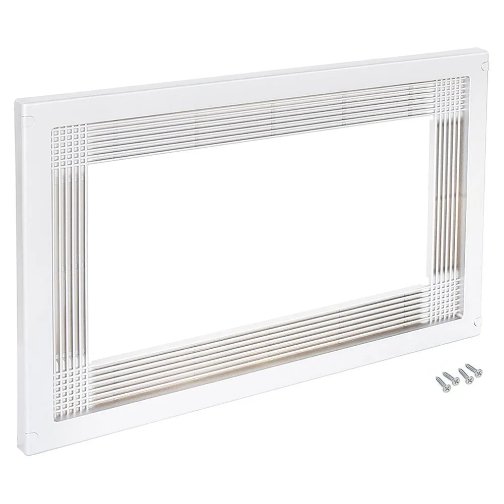 Marco para empotrar el microondas en un mueble de cocina de 600 mm de ancho fabricado en plástico, con 3 acabados disponibles: inyectado en blanco, pintado en gris metálico o con un recubrimiento de níquel satinado electrolítico (similar al acero inoxidable). Dispone de una rejilla debilitada para poder cortarla y ajustar el aparato, de manera que el microondas quede totalmente integrado en el mueble. Fácil de instalar, incluye todo lo necesario para su montaje: tornillos de fijación, tapas cubre tornillos y 4 bloques para posicionar el microondas a la altura adecuada.