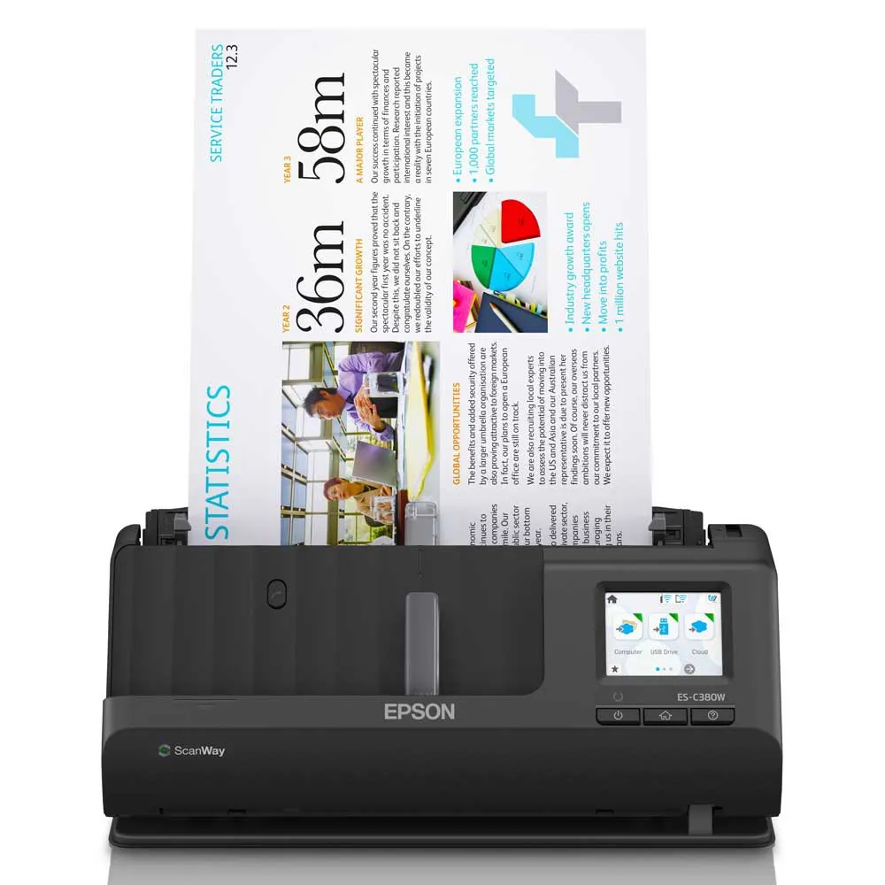 El escáner EPSON ES-C380W Black está equipado con una pantalla táctil incorporada que permite un funcionamiento fácil e intuitivo.