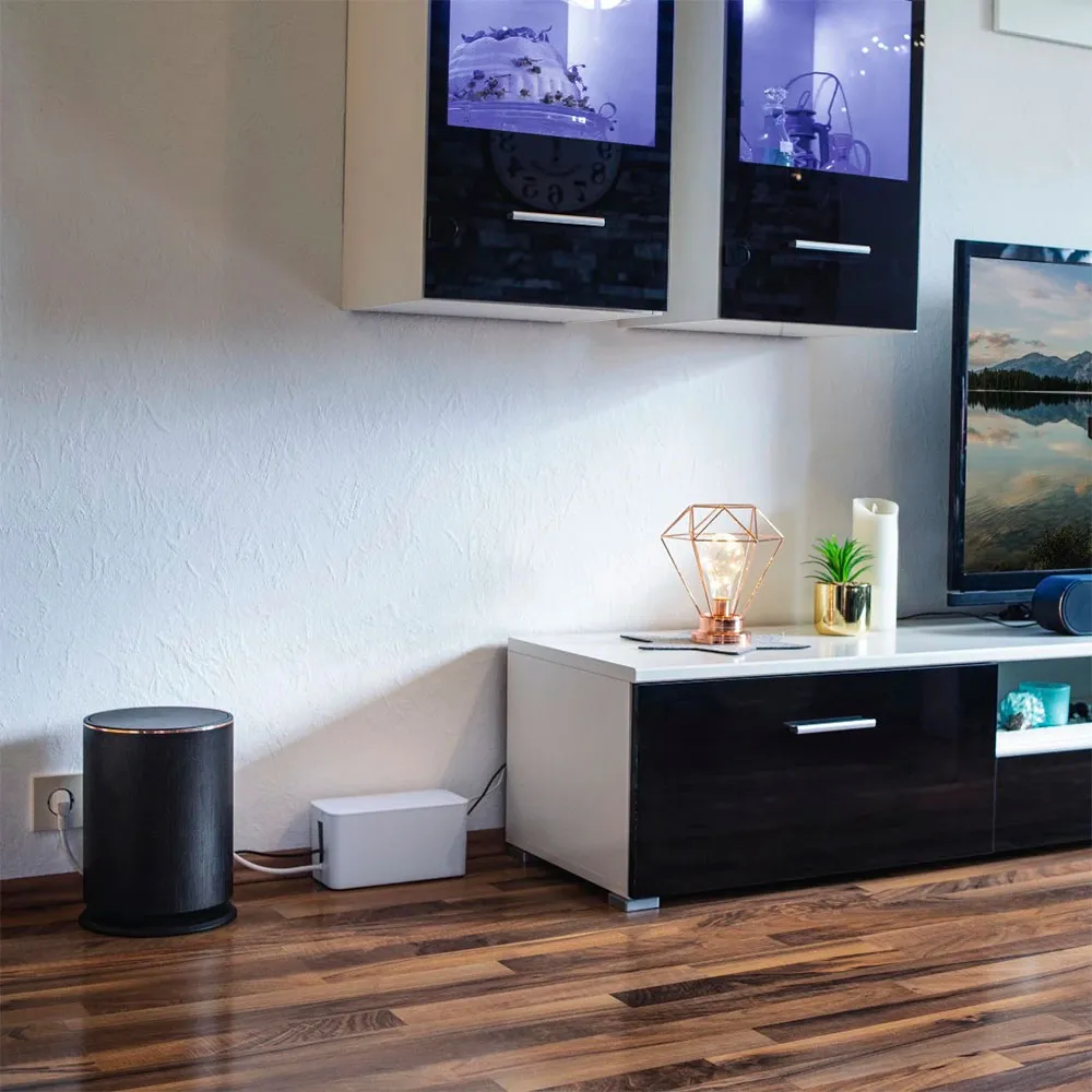 La funcionalidad es el núcleo del diseño del HAMA Mini. Las ranuras de salida de cables de tamaño generoso en dos lados permiten un enrutamiento de cables flexible y ordenado, acomodando múltiples cables con facilidad. Esto asegura que tus dispositivos permanezcan conectados sin crear un nuevo desorden fuera de la caja. Para mayor estabilidad, el organizador de cables está equipado con patas de goma para asegurar un soporte antideslizante y estable en cualquier superficie, desde escritorios pulidos hasta suelos de madera. Su acabado blanco limpio y diseño atemporal le permiten integrarse perfectamente con cualquier decoración, añadiendo un toque de sofisticación moderna Especificaciones Técnicas: