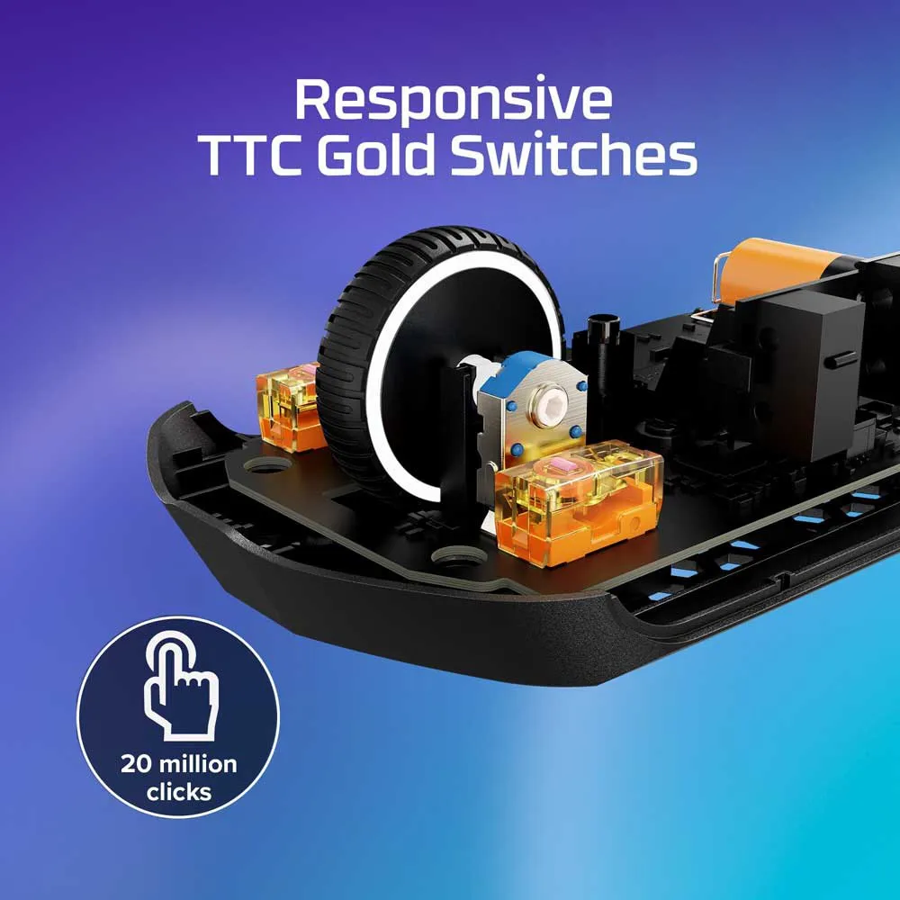 Ingrese al mundo de los juegos de alto rendimiento. Ingrese al mundo de los dispositivos de juego de alta calidad con el HyperX Pulsefire Haste 2 Core Wireless. Esta alternativa asequible al mouse Pulsefire Haste 2 original presenta una forma simétrica familiar y una construcción liviana con un peso operativo de solo 70 gramos[3]. Con una sola batería AAA, este mouse le permite jugar a través de una conexión de 2,4 GHz durante aproximadamente 100 horas[1]. También puede cambiar al modo Bluetooth para prolongar la duración de la batería, con una tasa de sondeo reducida ideal para juegos casuales. En el interior, encontrará el sensor HyperX Custom Core, que puede ofrecer hasta 12,000 DPI con una tasa de sondeo máxima de 1,000 Hz para acciones rápidas y movimientos suaves. Del mismo modo, disfrutará de los interruptores TTC Gold táctiles y resistentes en sus juegos, con una vida útil de hasta 20 millones de clics[4]. Los patines de baja fricción facilitan sus movimientos al deslizarse suavemente sobre las alfombrillas de tela. Además, disfrutará de todo el potencial del mouse Pulsefire Haste 2 Core Wireless cuando utilice el software HyperX NGENUITY[5]. Asigne rápidamente funciones y macros esenciales a la interfaz de 6 botones, configure con precisión los niveles de DPI para un seguimiento exacto, ajuste la tasa de sondeo para ajustar el rendimiento y, incluso, personalice la iluminación RGB y los efectos de luz para que se adapten a su estilo único. El mouse Pulsefire Haste 2 Core Wireless también está validado para NVIDIA Reflex[6] para optimizar la latencia del sistema de extremo a extremo con monitores compatibles.