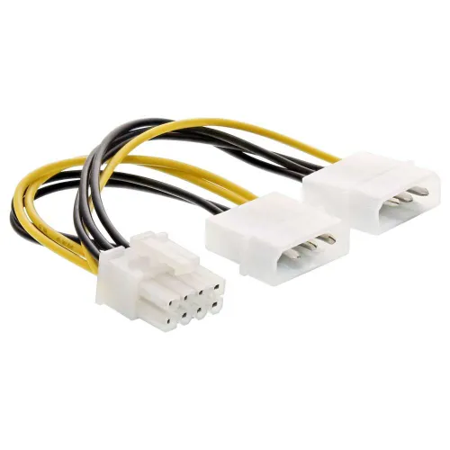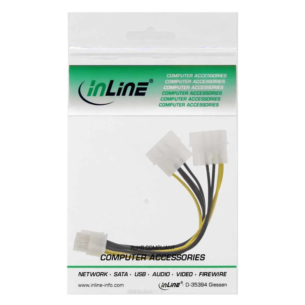 Cable adaptador de corriente InLine®, 2 conectores de 5.25" a conector PCI-Express de 8 pines. Cable adaptador de corriente InLine, 2 conectores macho de 5.25" / conector macho PCI-Express de 8 pines, 0.15m. Longitud del cable: 0.15 m, Conector 1: PCI-E (8 pines), Conector 2: 2 x Molex (4 pines).