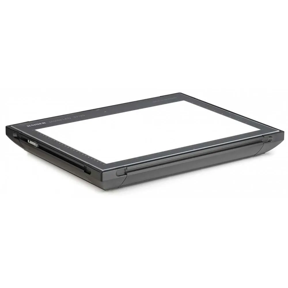 Caja de luz de luz diurna profesional con leds High Cri. Regulable sin escalonamientos. Ranura en T de 6 mm en las cuatro secciones laterales para la instalación en sistemas e instalaciones y para la fijación de accesorios. Adaptador de red independiente. Iluminación uniforme y de color correcto para visualización, clasificación y captura fotográfica (digitalización) de diapositivas y otros originales transparentes o de otros materiales.