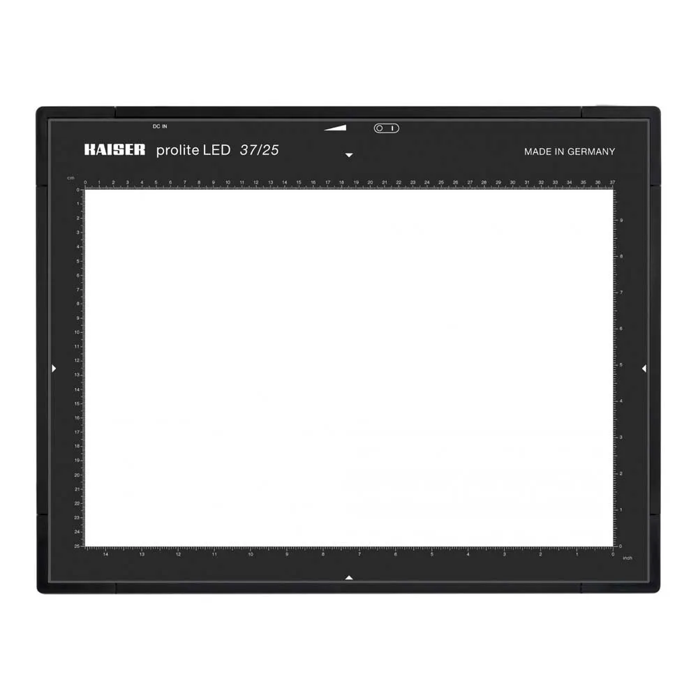 - Placa de vidrio acrílico de alta calidad con una transmisión de luz particularmente alta y también una difusión de luz optimizada, escalas en centímetros y pulgadas en el área iluminada.