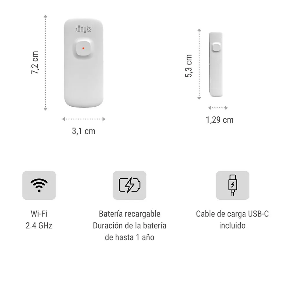 El sensor de puerta KONYKS Senso Charge 2 en blanco es un dispositivo sofisticado y versátil diseñado para mejorar la seguridad y la comodidad de tu hogar. Este sensor funciona con electricidad y se integra perfectamente con los sistemas domésticos inteligentes, lo que te permite monitorear y controlar tus puertas de forma remota.