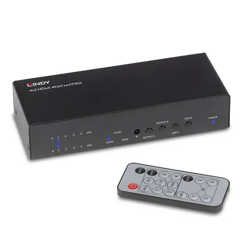 El conmutador de matriz Lindy 4x2 HDMI 4K60 es una solución de alto rendimiento para distribuir contenido desde múltiples dispositivos de origen a dos pantallas.