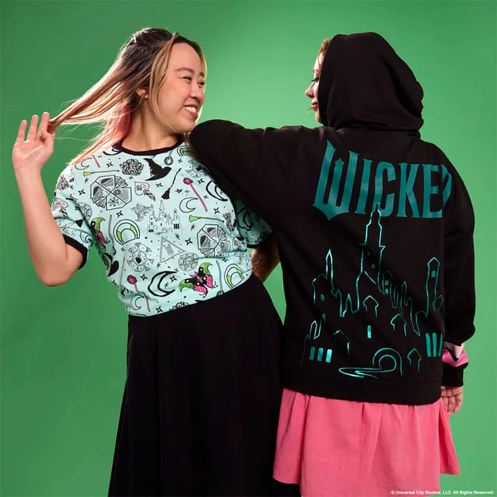 Esta camiseta LOUNGEFLY Wicked es una forma fantástica de expresar tu fanatismo por este querido musical. Ya sea que estés cantando "Defying Gravity" o recordando tus escenas favoritas, esta camiseta es la compañera perfecta. Es ideal para usar en el teatro, convenciones, encuentros con otros fans, o simplemente para añadir un toque de magia de Broadway a tu estilo diario. El diseño llamativo seguramente provocará conversaciones y te conectará con otros entusiastas de Wicked.