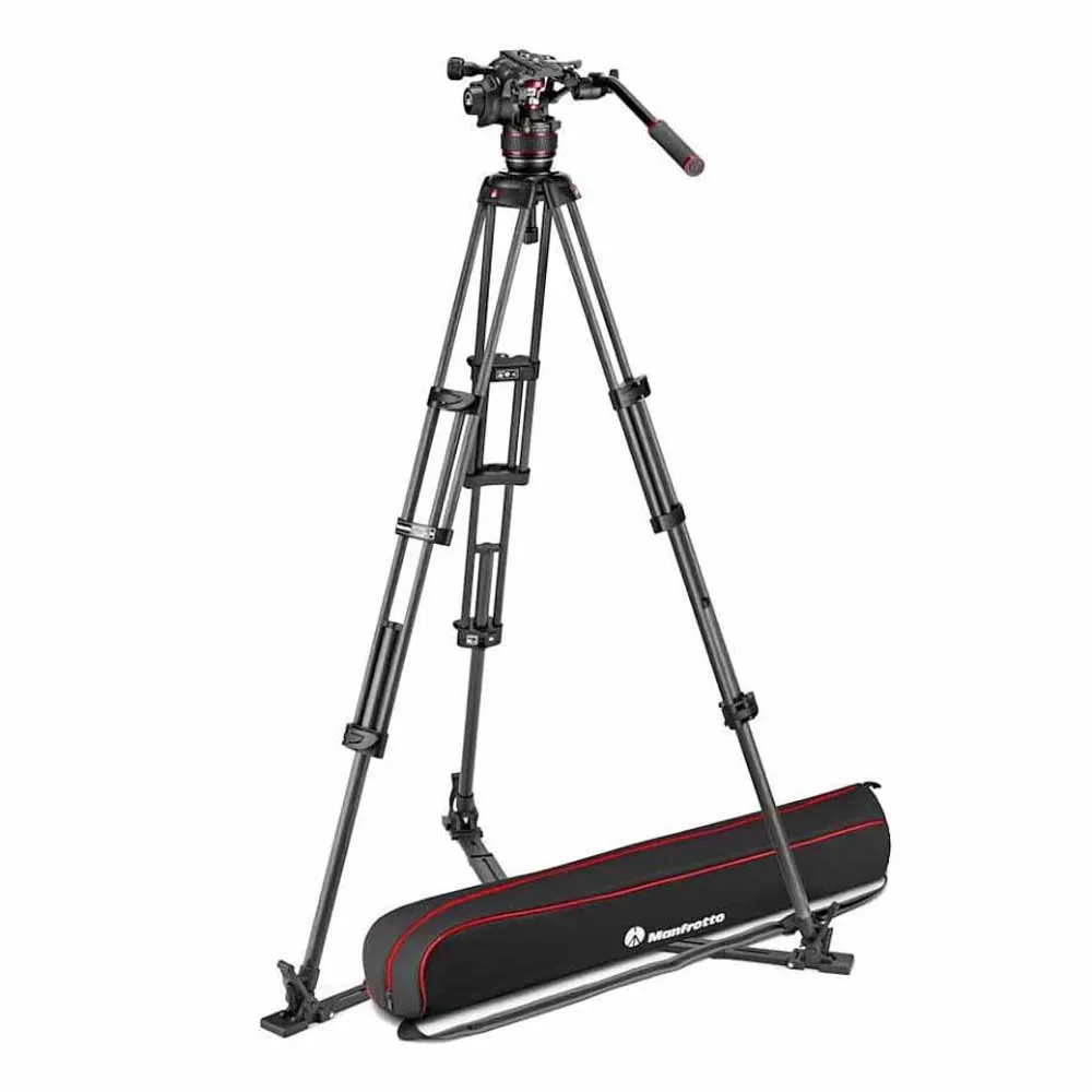 El sistema de video incluye el cabezal de video fluido NITROTECH 608 (base plana) y el MVTTWINGC de fibra de carbono de dos patas con trípode esparcidor de tierra.