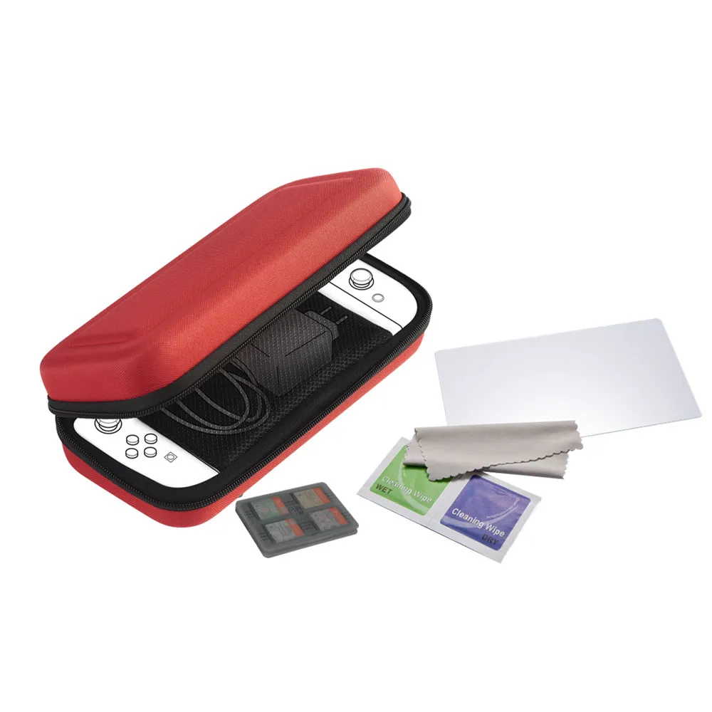Contenido del Paquete: 1x Estuche de Viaje Protector, 1x Protector de Pantalla de Vidrio Templado con kit de aplicación, 2x Fundas Protectoras de Silicona, 2x Protectores para Pulgares, 1x Estuche de Almacenamiento para Tarjetas de Juego, 1x Paño de Limpieza de Microfibra