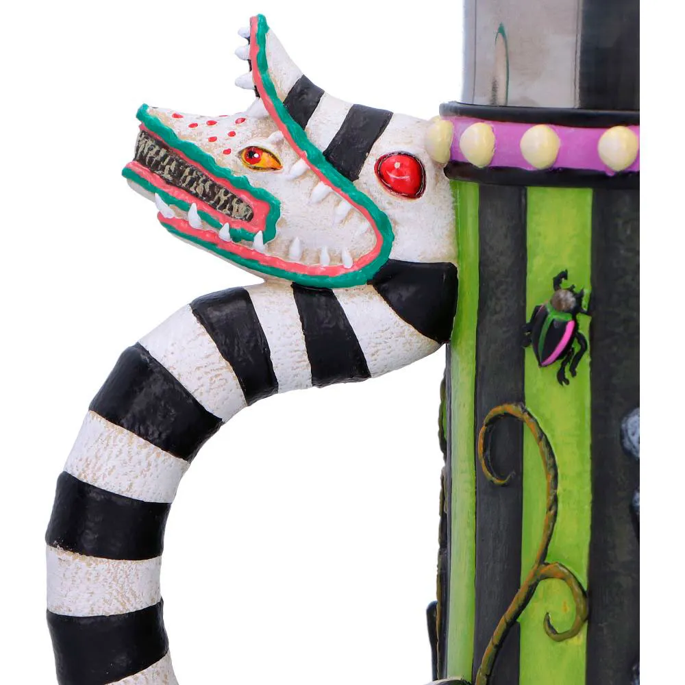 Este tarro magistralmente elaborado captura la estética caótica y caprichosa de Beetlejuice con impecable detalle. El cuerpo principal presenta las icónicas rayas blancas y negras, instantáneamente reconocibles para cualquier fan del bio-exorcista. Enroscándose amenazadoramente alrededor del contenedor hay un Gusano de Arena meticulosamente detallado, con su monstruosa cabeza de doble boca elevándose por encima de la tapa para formar un asa única y terriblemente práctica. Cada escama, diente y raya está expertamente representado y pintado a mano para garantizar un acabado de alta calidad, haciendo de cada tarro una pequeña obra de arte. Como producto con licencia oficial, tienes garantizada una pieza auténtica de memorabilia que honra el material original con precisión y cuidado.
