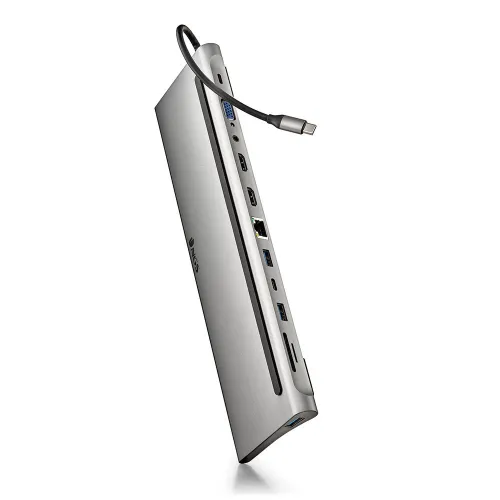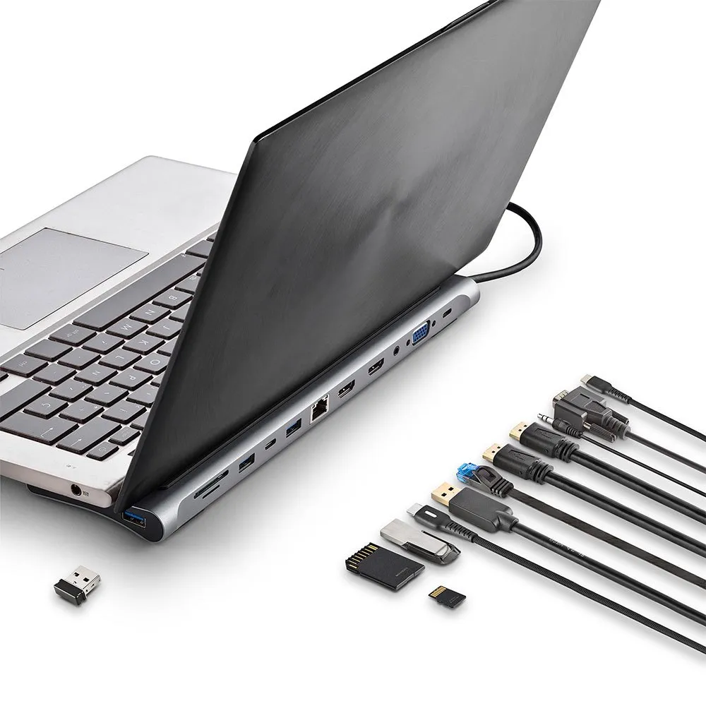 - Conexiones múltiples: Adaptador 12 en 1 que incluye puertos USB 2.0, 2x USB 3.0, 2x HDMI, VGA, entrada de audio, PD (Power Delivery), RJ45 (Ethernet), USB-C y ranuras para tarjetas SD/TF. Cubre una amplia gama de necesidades de conectividad.