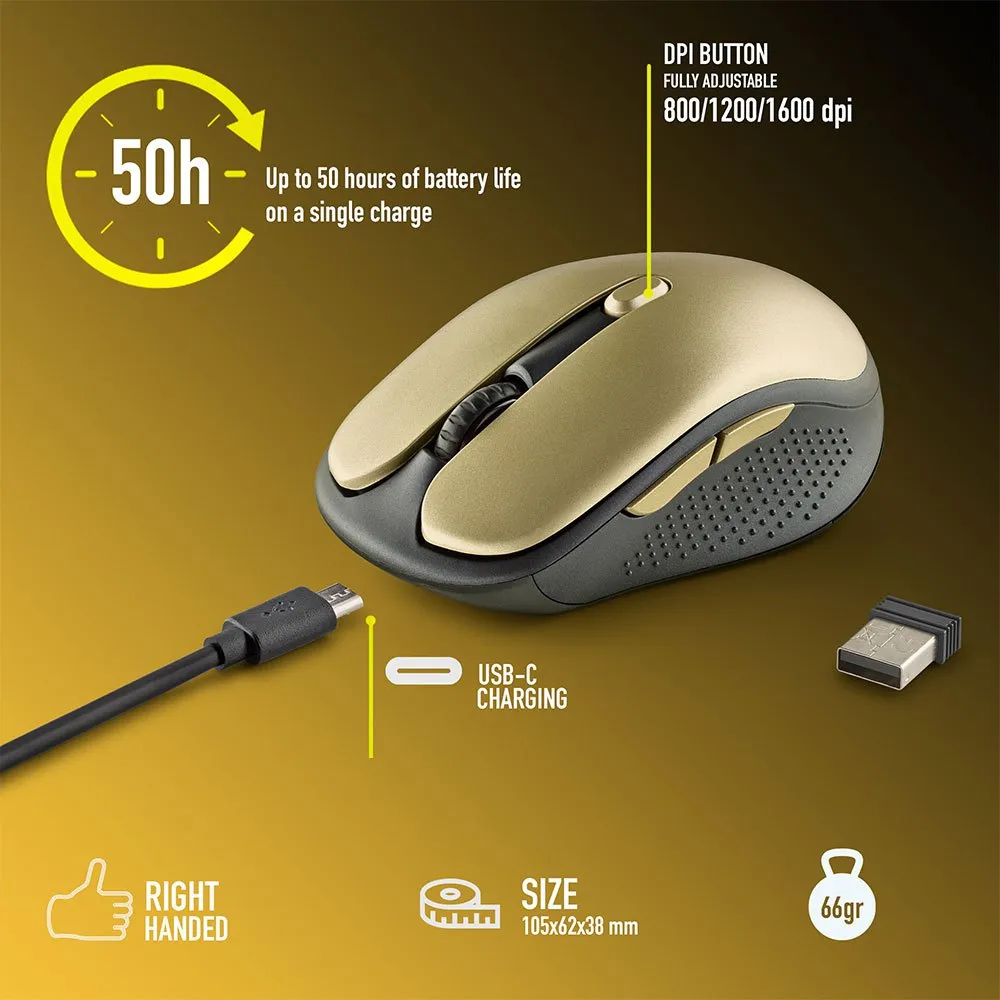Ngs ratón inalambrico recargable silencioso dorado ratón inalámbrico recargable con teclas silenciosas especial para portátil marca ngs modelo evorustice características - 5 botónes y rueda scroll - botónes silenciosos - recargable - dpi completamente ajustables:800 - 1200 - 1600 - batería 600mah - tamaño compacto contenido embalaje - ratón evo rust ice - cable de carga micro usb - 1 x aa batería 600mah - guía de instalación.