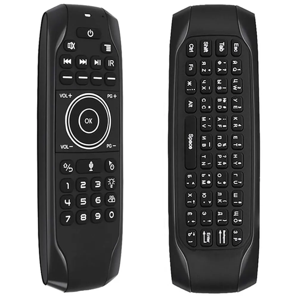 Air Mouse y Mini Teclado G7V Pro, teclado QWERTY en la parte trasera y mando de control frontal.