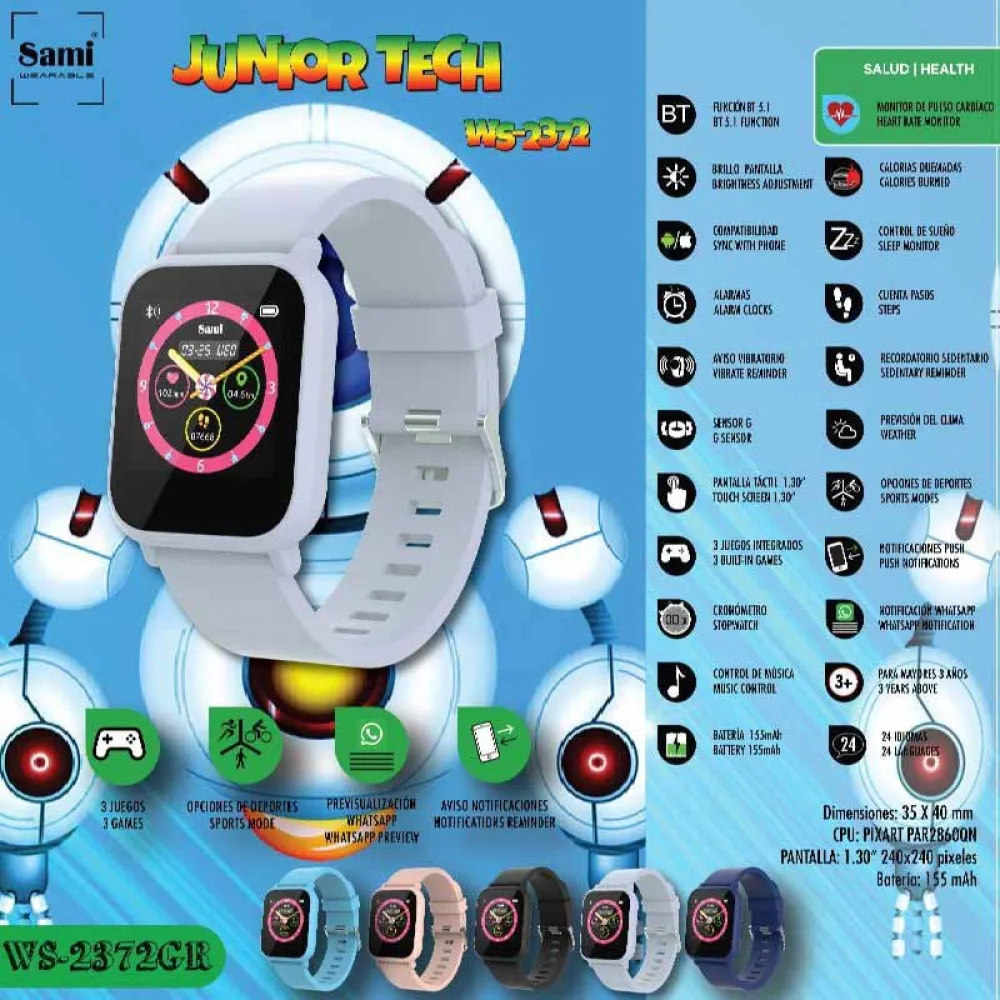 El smartwatch SAMI Junior Tech es la manera perfecta de mantener a tu hijo conectado, seguro y entretenido. Es el regalo ideal para cualquier niño que ame explorar y mantenerse activo.