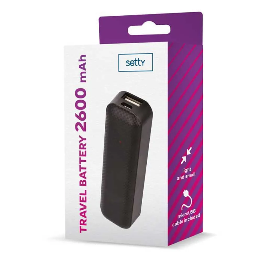 En la Caja: 1 x Batería Externa Setty Mini 2600mAh, 1 x Cable de Carga Micro-USB, Manual de Usuario