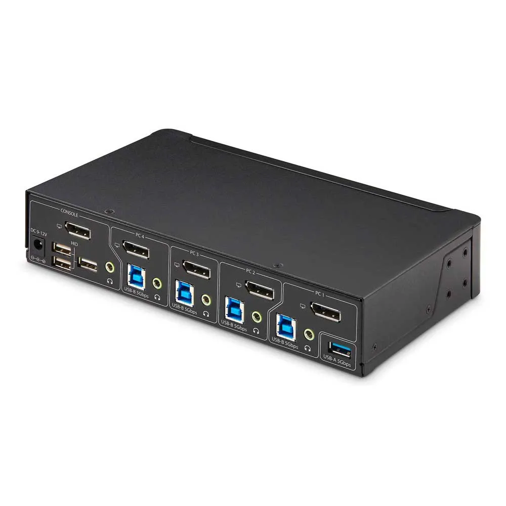 Este conmutador KVM DisplayPort permite a los usuarios cambiar entre cuatro computadoras de escritorio equipadas con USB-A y DisplayPort. Facilita compartir un monitor DisplayPort 4K a 60 Hz, un teclado, un mouse, dos dispositivos USB de 5 Gbps, un dispositivo de salida de audio estéreo y cuatro dispositivos USB 2.0.