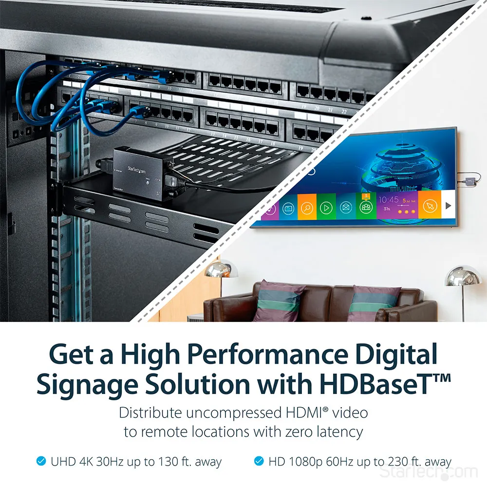 El kit extensor StarTech HDBaseT extiende HDMI hasta 230 pies (70 metros) sobre un solo cable CAT5e o CAT6.