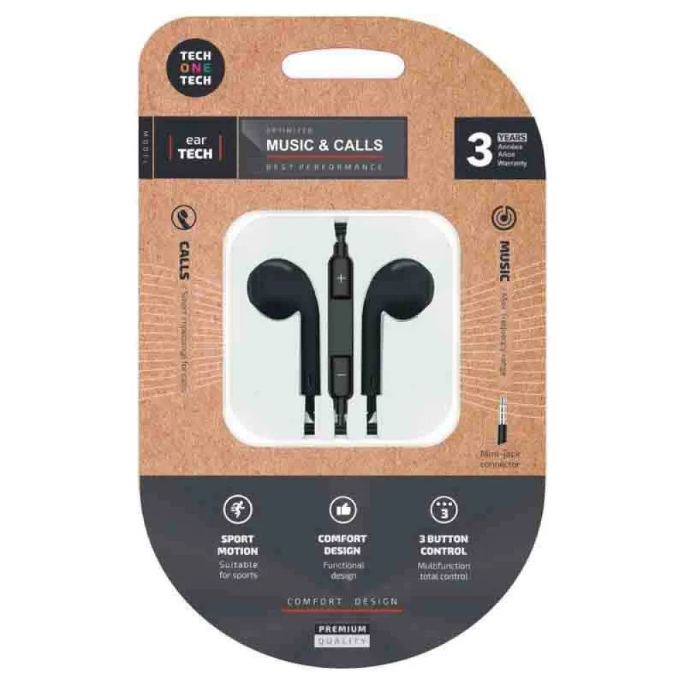 - Auriculares ergonómicos EarTECH, sonido estéreo, con micrófono, controles de volumen y tercer botón multifunción.