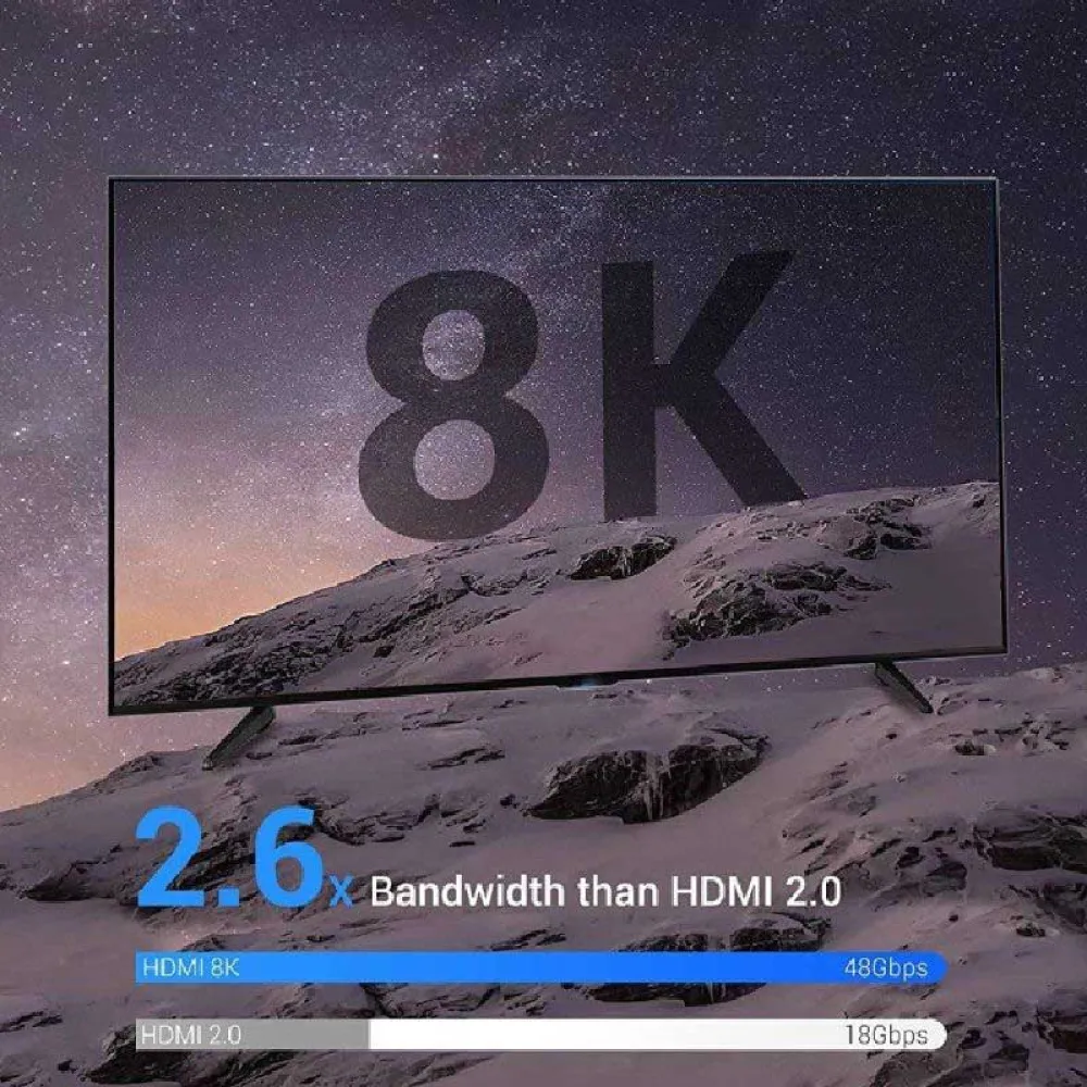 Con la tecnología de procesamiento de color dinámico 8K y 12 bits única de HDMI y el ancho de banda de 48 Gbps, puede brindar una experiencia cinematográfica de ultra alta definición y un efecto visual 3D con imágenes más claras y realistas, colores más ricos.