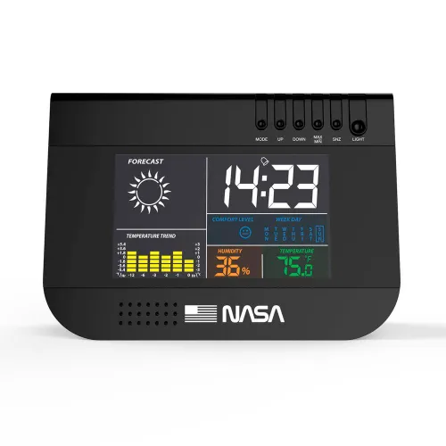 AGFA WS100 on monitoiminen keskus kotiisi. Siinä on radiokontrolloitu kello (DCF), joka synkronoituu automaattisesti atomikellon kanssa vertaansa vailla olevan tarkkuuden saavuttamiseksi, joten sinun ei koskaan tarvitse asettaa aikaa tai säätää kesäaikaa. Se toimii myös täydellisenä herätyskellona torkkutoiminnolla, mikä tekee siitä täydellisen yöpöytäkumppanin. Herää tietäen paitsi ajan myös täydellisen säänäkymän päivällesi. Lisäominaisuudet, kuten kuun vaiheen näyttö ja lämpötilan ja kosteuden min/max-ennätykset, lisäävät toisen kerroksen yksityiskohtaista ympäristön seurantaa. Suunniteltu moderniin elämään, tämä elegantti laite sopii saumattomasti mihin tahansa huoneeseen, keittiöstä makuuhuoneeseen tai toimistoon. Yhtenä markkinoiden monipuolisimmista sääasemista AGFA WS100 on investointi mukavuuteesi, terveyteesi ja päivittäiseen suunnitteluusi.