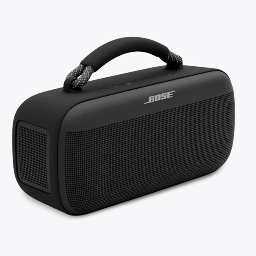 Musta Bose SoundLink Max on kannettava kaiutin, jossa on IP67-vesitiiviys, 20 tunnin akunkesto ja 5 tunnin latausaika. Se käyttää Bluetooth-versiota 5.4, jonka kantama on 9 metriä, ja se on yhteensopiva Bose Music -sovelluksen kanssa henkilökohtaista kauko-ohjausta varten.